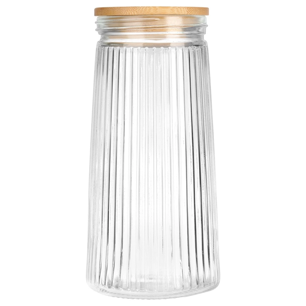 Elegant borcan din sticlă cu volum de 1,4 l, cu garnitură din silicon și capac din bambus, păstrează alimentele proaspete mai mult timp. Fabricat din sticlă borosilicată rezistentă, cu striații decorative pentru priză ușoară și un aspect stilat pentru orice bucătărie. Ideal pentru cafea, paste, müsli sau nuci. Borcanul este etanș la aer, rezistent la temperaturi și potrivit pentru mașina de spălat vase (fără capac).