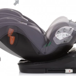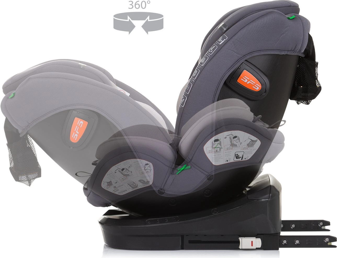 Baza rotativă permite prinderea rapidă cu fața spre ușă și trecerea lină între poziția cu spatele la sensul de mers (40–105 cm) și cu fața la sensul de mers.
