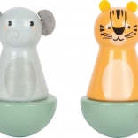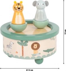 Această cutie muzicală clasică aduce copiilor o stare de calm înainte de somn și bucurie în timpul jocului. Două figurine din lemn – un tigru și un elefant – sunt fixate în partea superioară cu ajutorul magneților, se rotesc în timpul redării și pot fi ușor îndepărtate pentru joacă separată. Lacurile de calitate și suprafețele netede sunt blânde cu mâinile copiilor.
