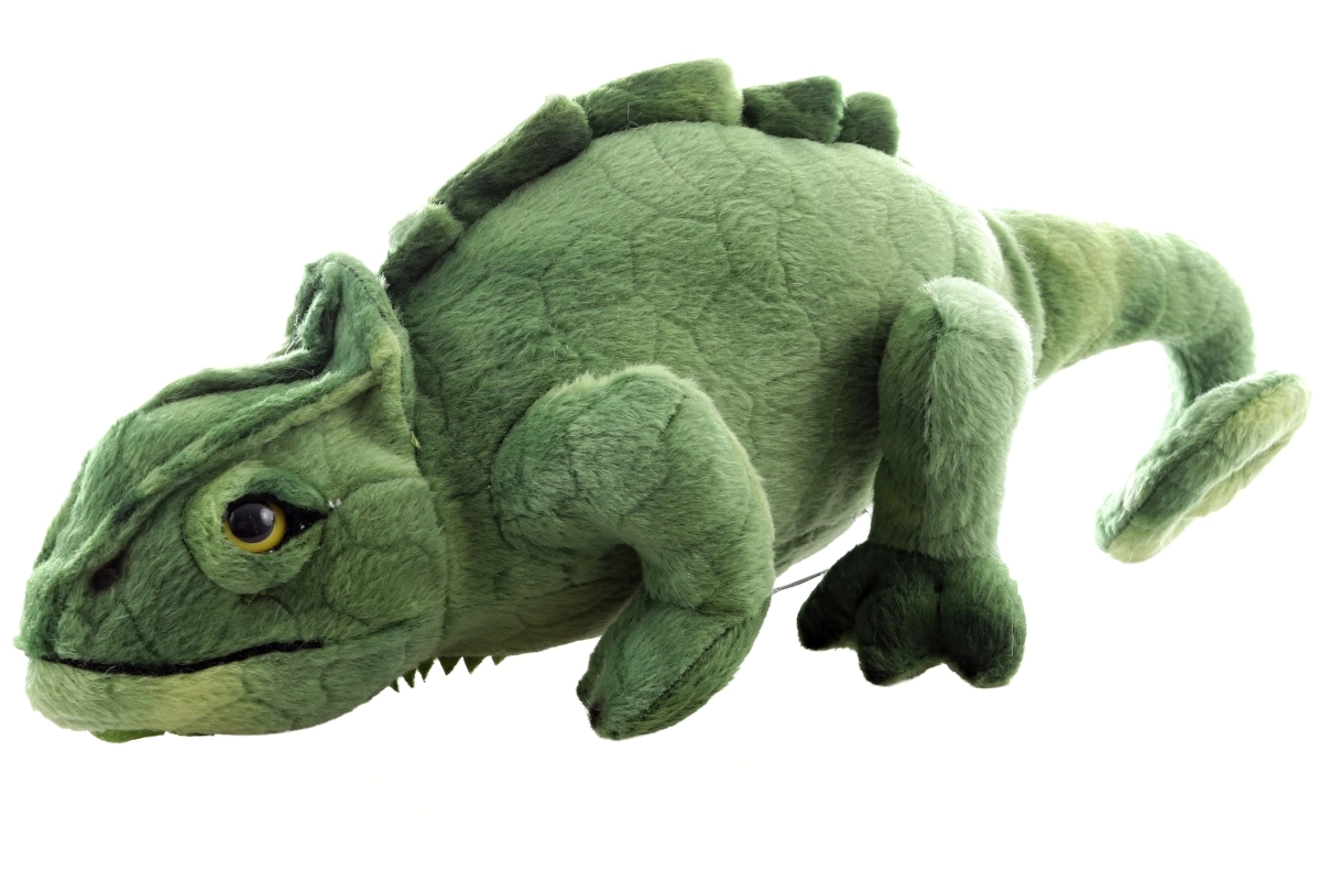 Un cameleon de pluș drăgălaș și moale, cu lungimea de aproximativ 27 cm, ideal pentru alint și joc imaginativ. Sigur pentru copii de la 0 ani, din material plăcut cu textură fină și cusături detaliate. Un cadou grozav pentru iubitorii de animale și jucării eco-friendly.