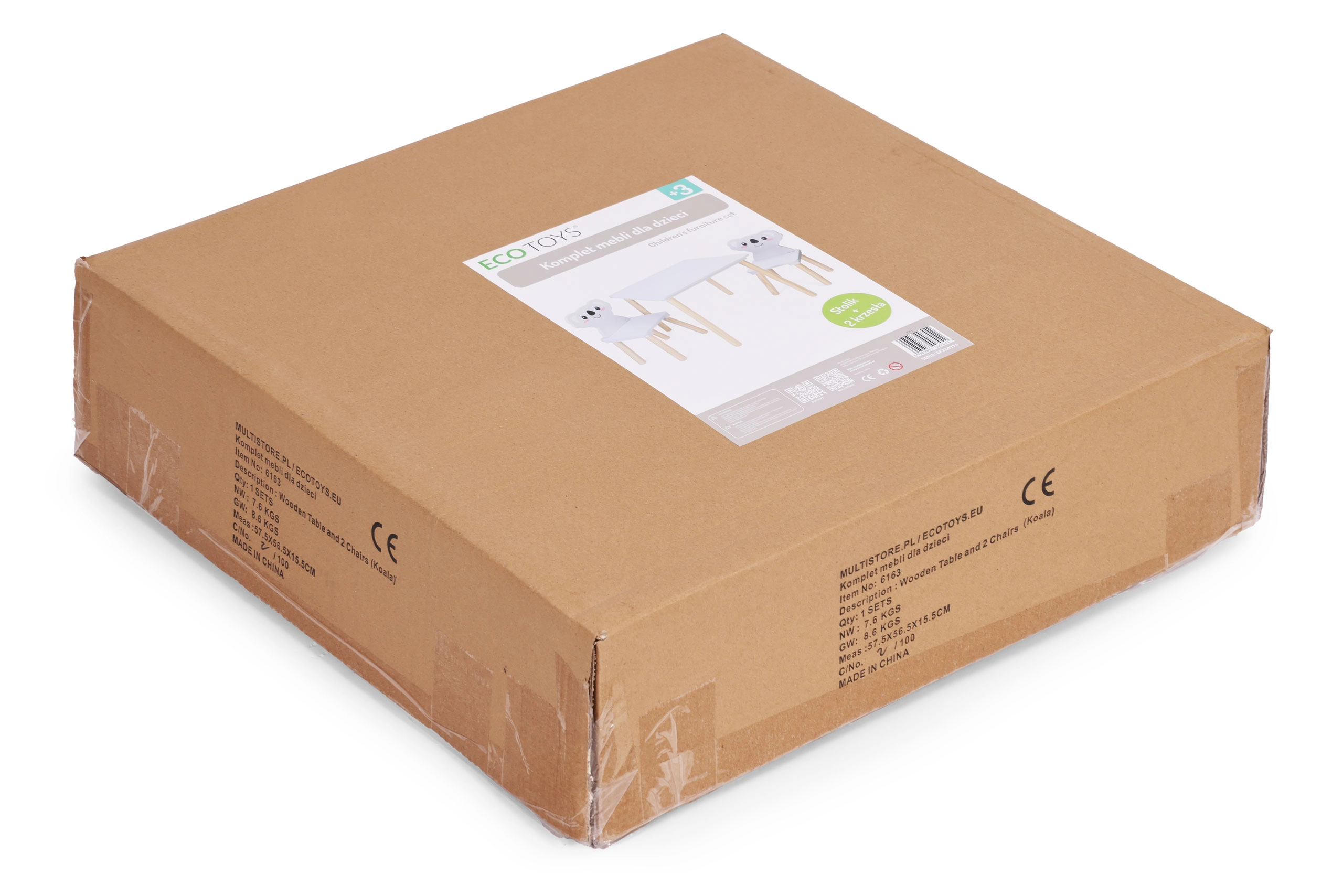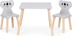 Setul de mobilier ECOTOYS transformă camera într-o zonă creativă de joacă. Blatul larg al măsuței oferă suficient spațiu pentru desen, construcții și lucru manual și este ușor de întreținut. Cele două scaune cu spătare în formă de koala îi încântă pe copii prin estetica jucăușă și susțin în același timp o postură corectă la ședere.