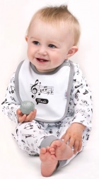 Ştrampi parţiali pentru bebeluşi New Baby Music, moi şi respirabili, din bumbac 100% plăcut, cu imprimeu jucăuş cu note şi instrumente muzicale. Au talie lată care nu strânge, închidere cu capse între picioruşe şi sunt potriviţi pentru băieţi şi fetiţe.