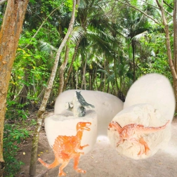 Fiecare ou din ghips ascunde o minifigurină colorată a unui dinozaur diferit. Copiii vor trăi douăsprezece aventuri separate și își vor crea propria colecție.