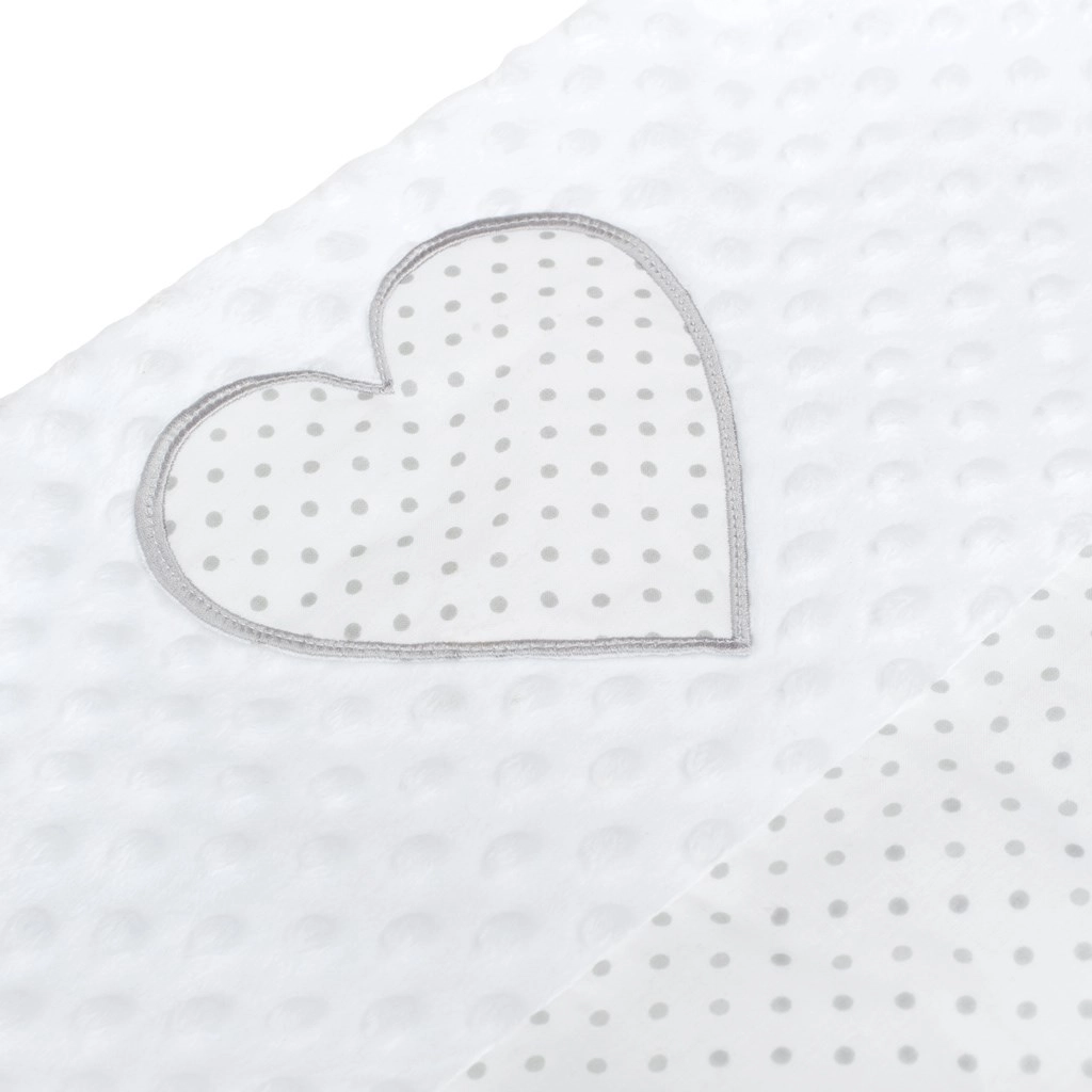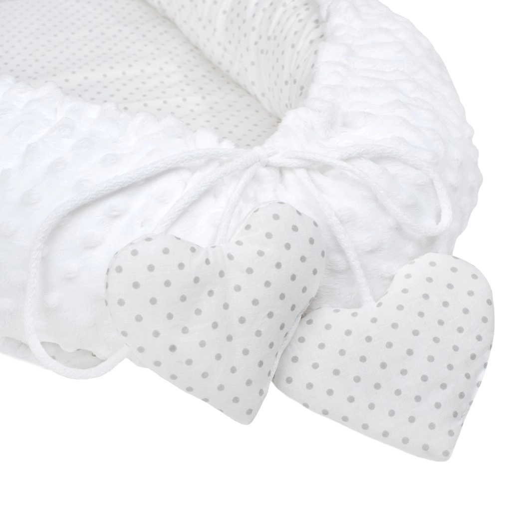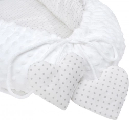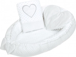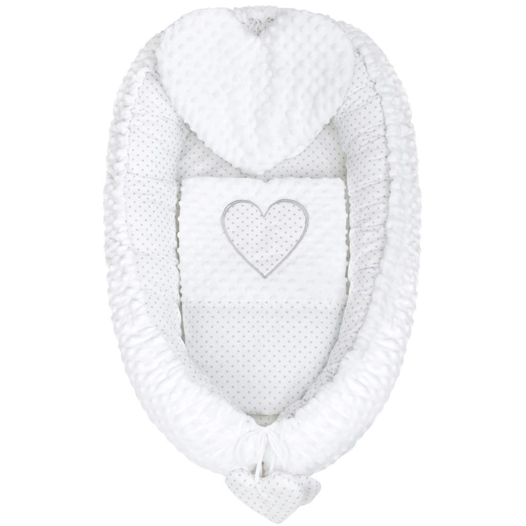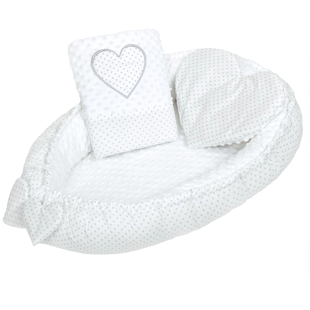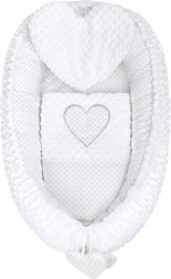 Cuibușorul confortabil și sigur pentru bebeluși New Baby Minky Inimioară, în culoarea albă, combină țesătură Minky extra moale și 100% bumbac pentru confort maxim. Datorită șnurului de reglare, ajustați ușor dimensiunea și creați pentru bebeluș un mediu liniștit și protejat în pătuț, cărucior sau pe canapea. Setul include perniță în formă de inimă și plăpumioară cu inimioară.