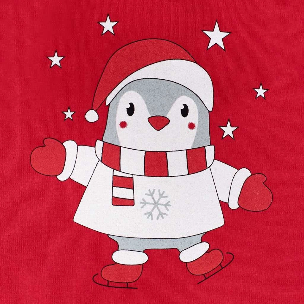 Salopetă adorabilă pentru bebeluși din 100% bumbac, în roșu intens, cu motiv de pinguin, care va înveseli orice garderobă de iarnă. Închiderea cu capse pe bretele și între piciorușe ușurează îmbrăcarea și schimbarea scutecului. Designul universal este potrivit atât pentru fetițe, cât și pentru băieței și se potrivește de minune ca ținută de Crăciun.