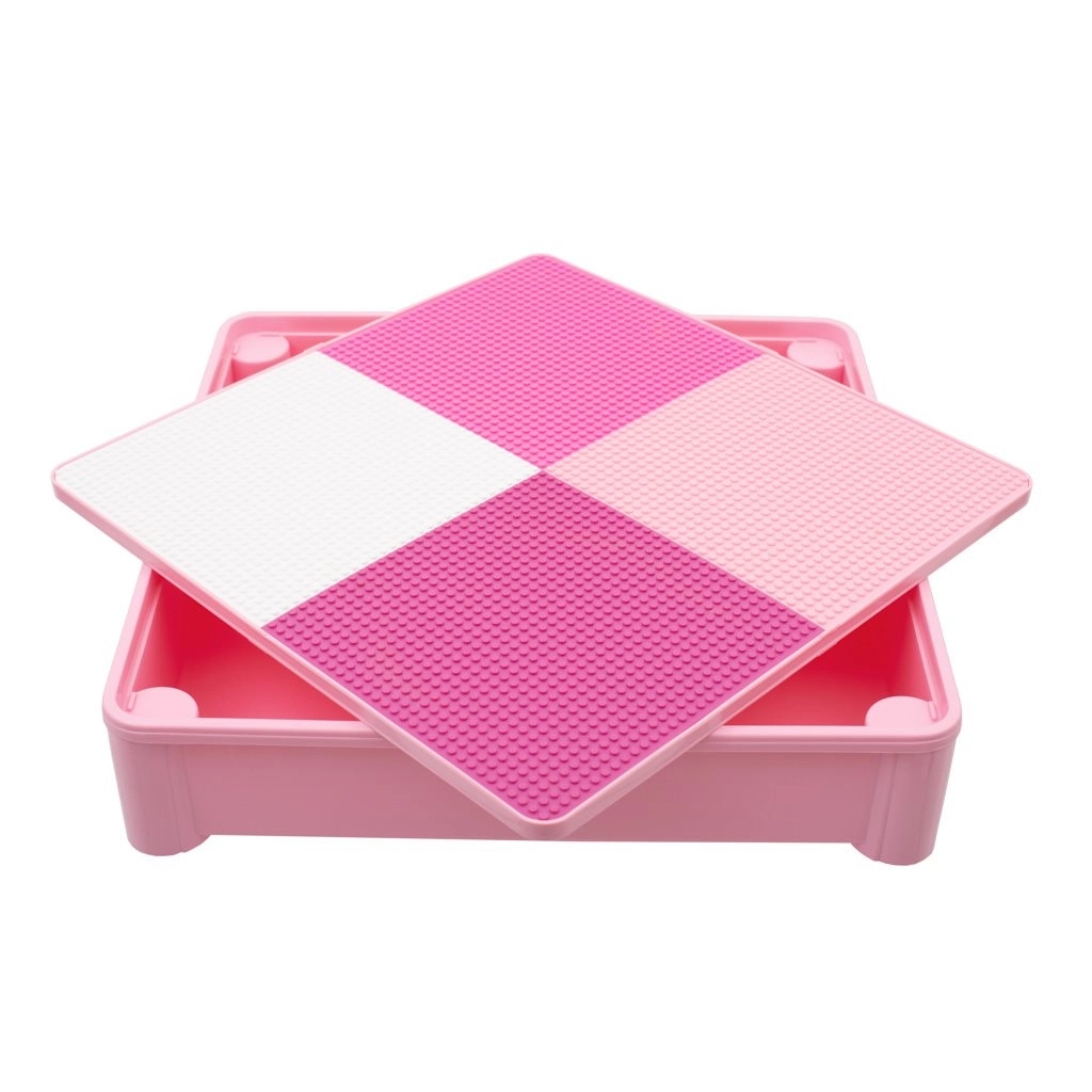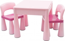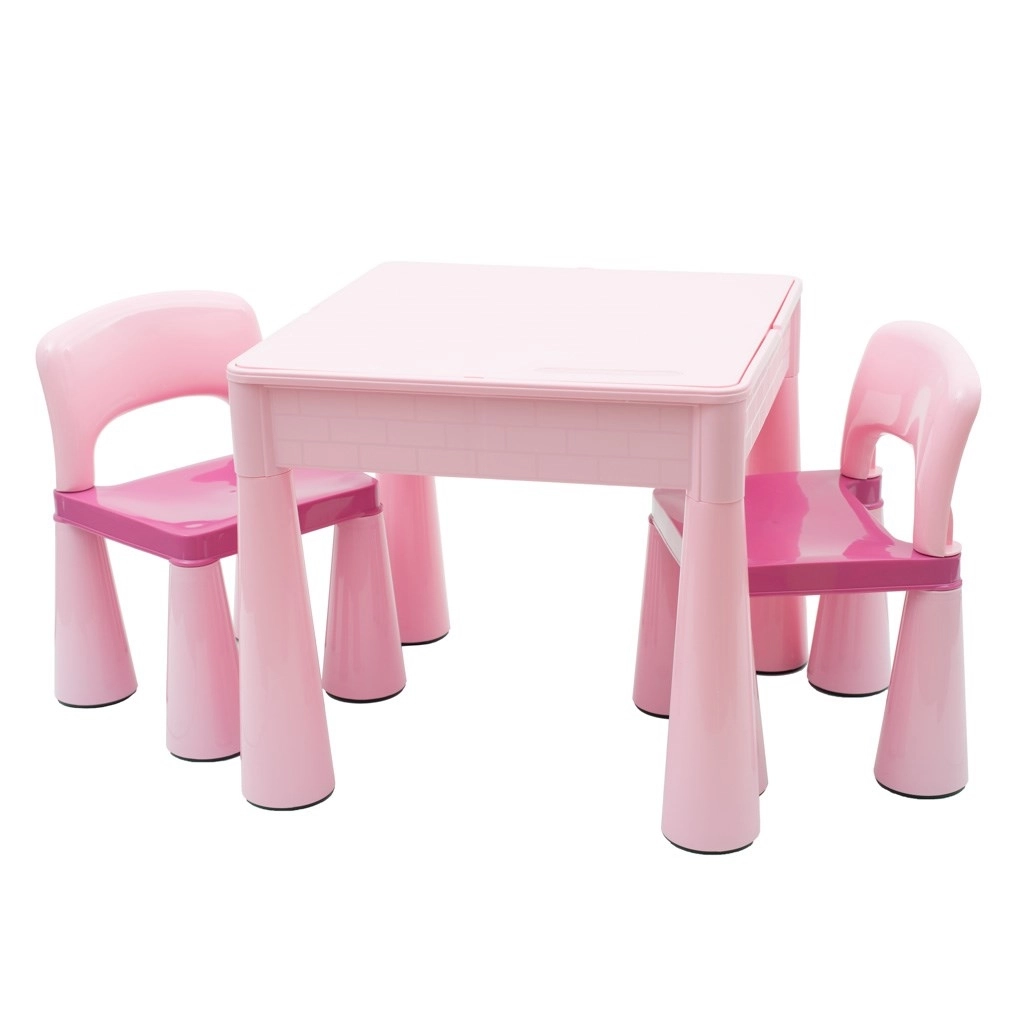 Setul practic pentru copii New Baby include o măsuță și două scăunele într-o elegantă culoare roz. Masa are un blat reversibil: după întoarcere servește ca placă de bază pentru LEGO și LEGO DUPLO. Sub blat se află un spațiu de depozitare pentru jucării sau materiale de creație și, la nevoie, poate fi folosit și ca mini nisipar sau pentru joacă cu apă.