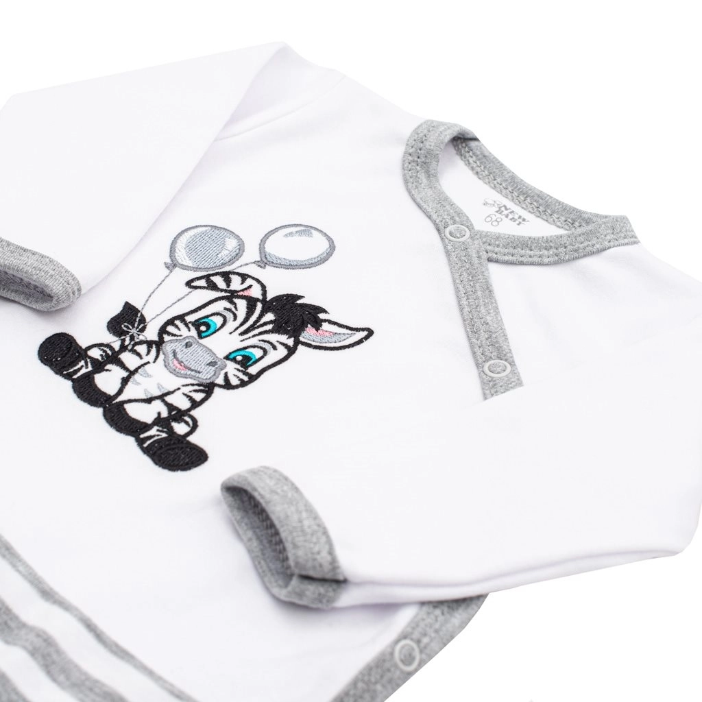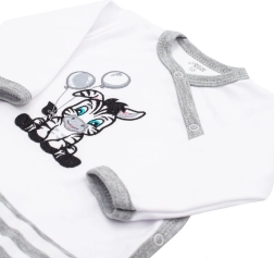 Motivul drăguț cu zebră este căptușit cu material, astfel încât broderia să nu irite pielea sensibilă a bebelușului. Partea inferioară cu imprimeu în dungi oferă salopetei un aspect jucăuș, iar croiala face ca spatele să rămână mereu acoperit chiar și în timpul mișcării active.