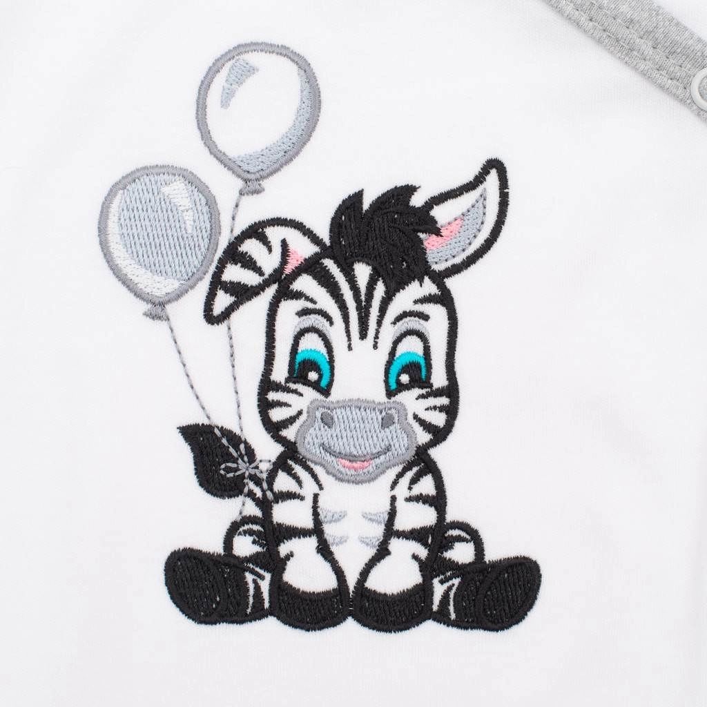 Salopetă drăguță și practică pentru bebeluși, din bumbac moale 100%. Datorită închiderii laterale cu capse se îmbracă ușor, iar spatele acoperit în timpul mișcării asigură căldură și confort. Broderia cu zebră cu căptușeală protejează pielea sensibilă, iar partea inferioară cu imprimeu în dungi pe toată suprafața adaugă stil.