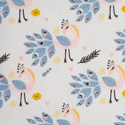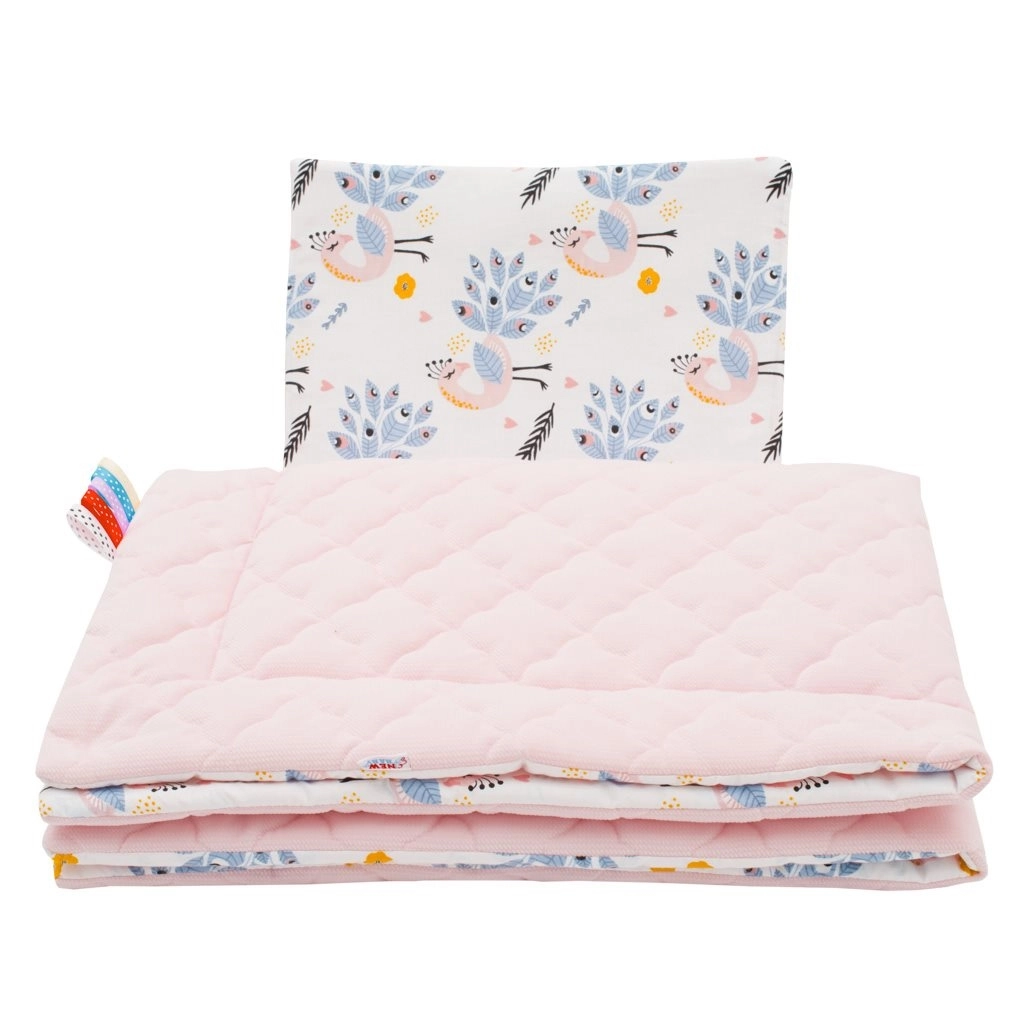 Acest set elegant, reversibil, pentru cărucior, în nuanță roz cu motiv păuni, oferă un echilibru perfect între practic și catifelat. O parte este din 100% bumbac de calitate cu imprimeu modern pentru copii, cealaltă din catifea (100% poliester), plăcută la atingere și cu formă durabilă. Totul este umplut cu fibră antialergenică pentru siguranța și confortul pielii sensibile a copilului.