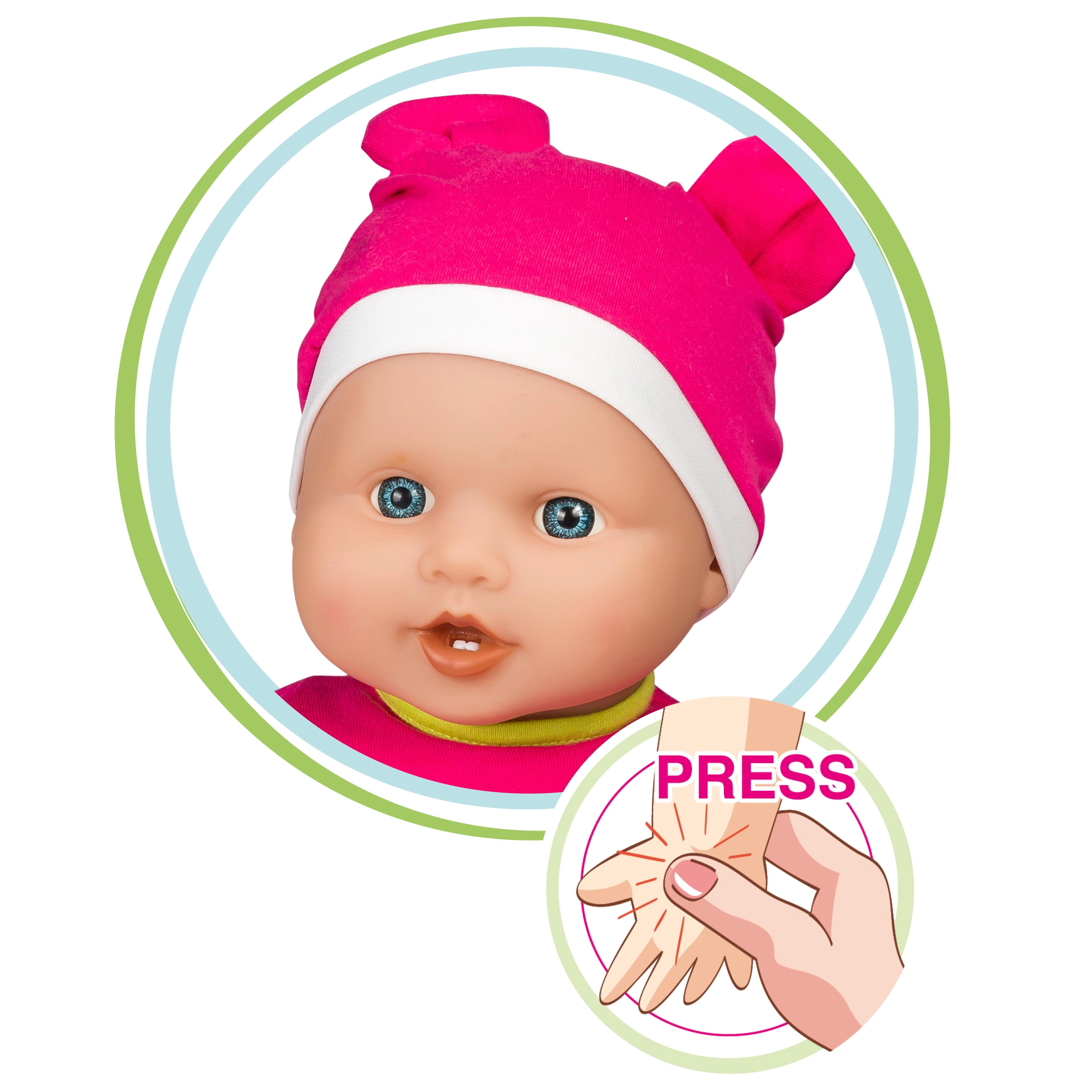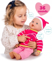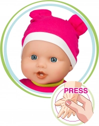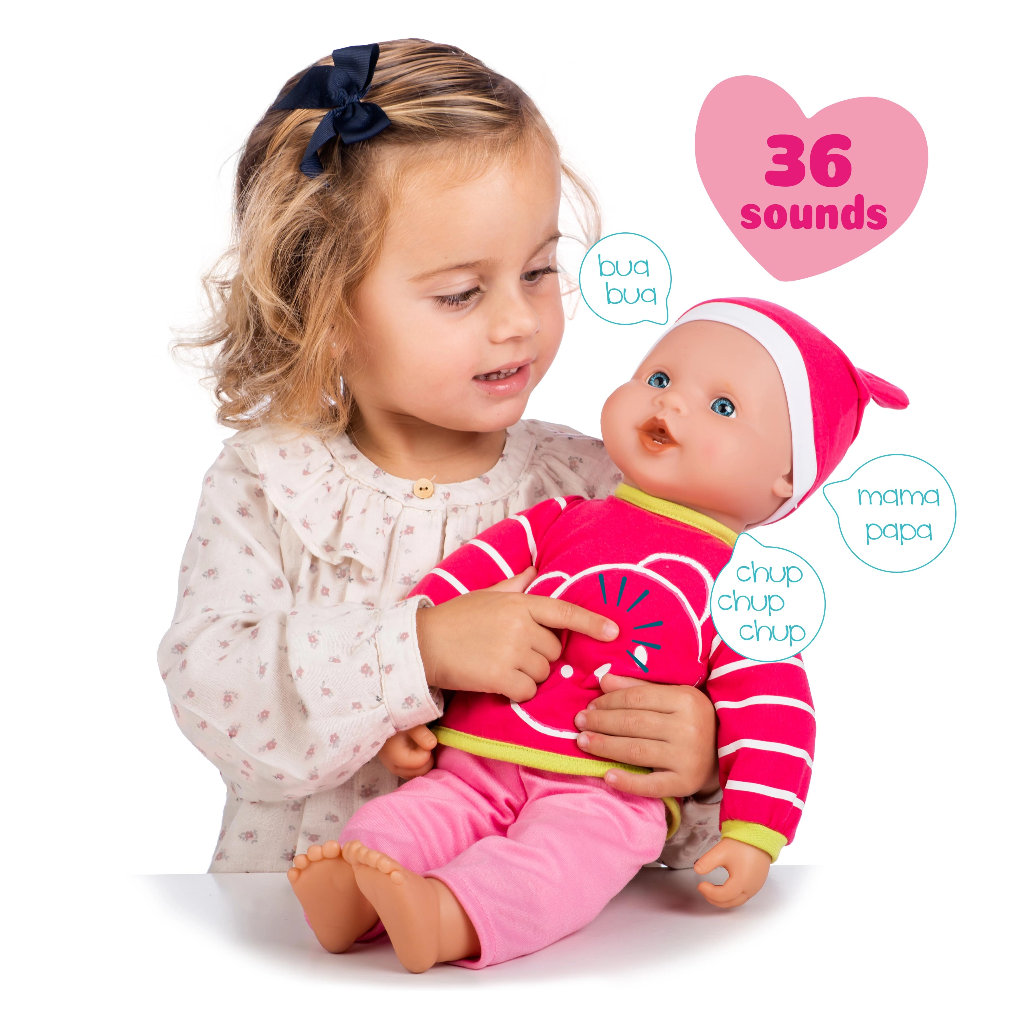 La apăsarea butonului de pe piept, bebelușul redă 36 de sunete diferite, care stimulează imaginația și dezvoltă abilitățile sociale în jocurile de rol. Bateriile 3× LR44 sunt incluse în pachet, astfel încât joaca poate începe imediat.