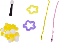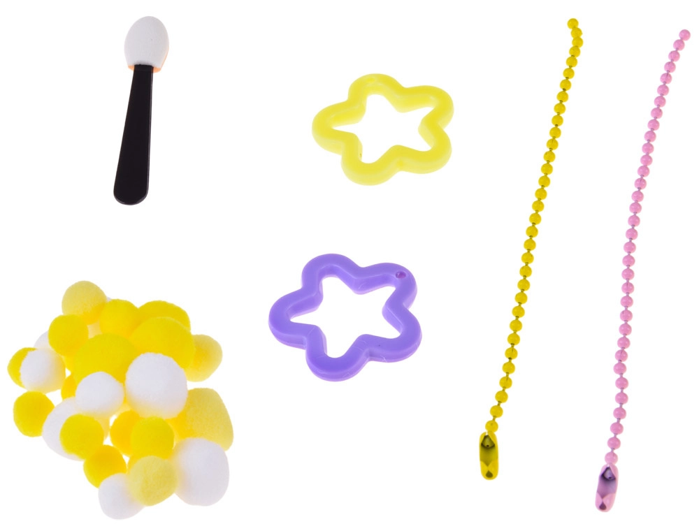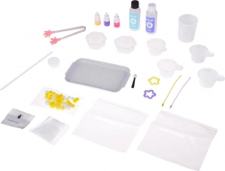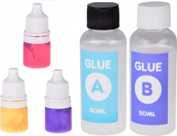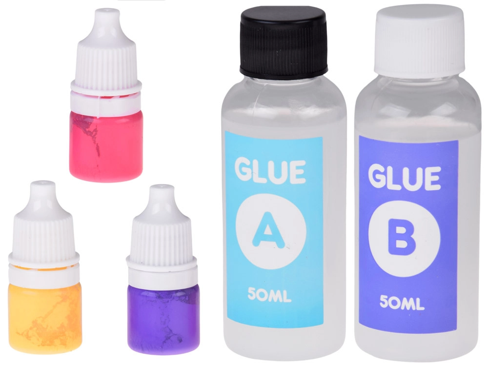 - Formă pentru 2 slime-uri, bețișor de amestecare, cleștișori, 2× adeziv (A+B), recipient gradat, burețel/aplicator, 3× colorant, biluțe decorative moi, mănuși de protecție, 2× steluță, 4× pahar transparent, 2× săculeț decorativ, 2× lanțișor pentru breloc, tăviță