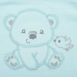 - Aspect drăgălaș: motiv cu ursuleț și păsărică, model de țesătură atrăgător