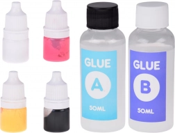 - Formă pentru 4 slime-uri, spatulă de amestecare, cuțitaș din plastic, 2× adeziv (A+B), recipient gradat, 4× colorant, biluțe decorative moi, mănuși de protecție, 4× steluță, 4× pahar transparent, 4× săculeț decorativ, 4× lanțișor pentru breloc, tăviță