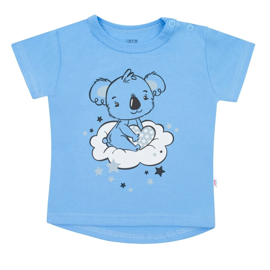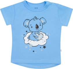 Pijama de vară pentru copii, adorabilă, din 100% bumbac moale, în culoare albastru deschis, încântă prin motivul delicat cu koala pe un nor. Setul este format din tricou cu mânecă scurtă și șorturi cu imprimeu integral. Capsele de pe umăr facilitează îmbrăcarea, iar tal ia elastică a șorturilor este blândă cu burtica bebelușului.