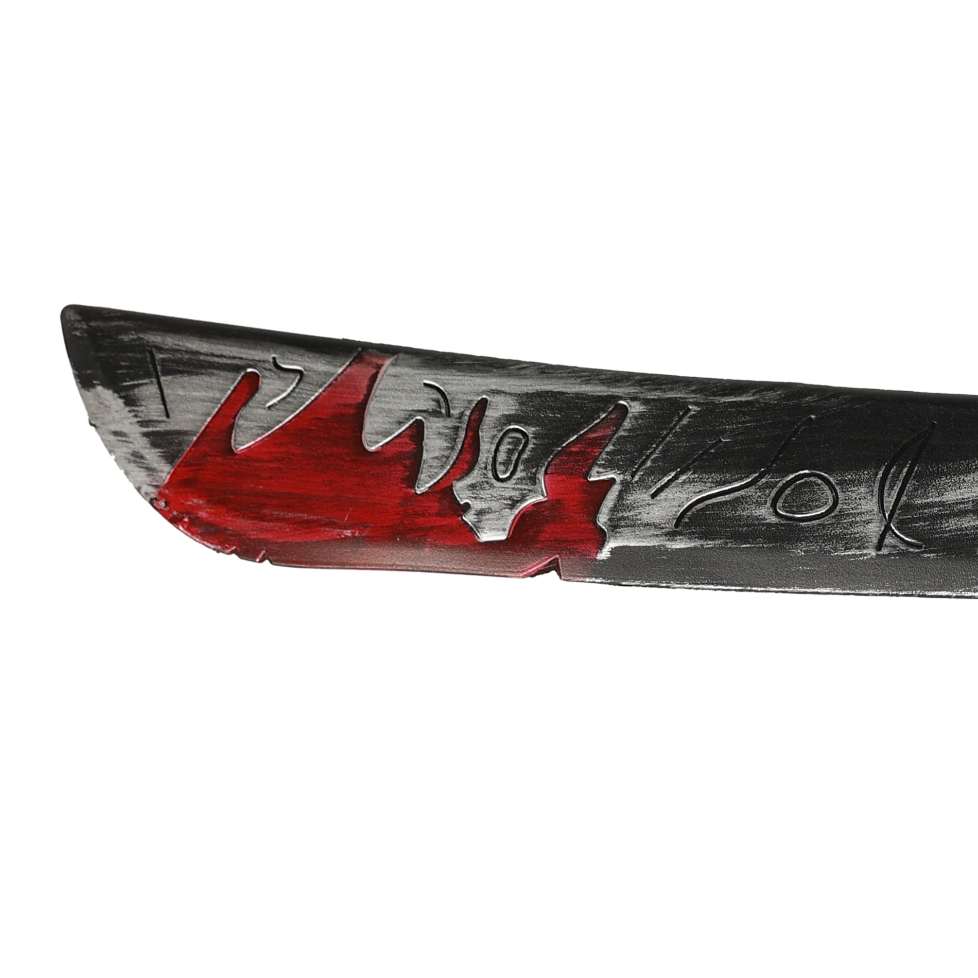 - Lama gri „metalică”, detalii sângeroase roșii, mâner maro
