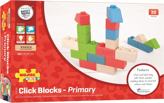 Construcție din lemn Bigjigs Baby este destinată copiilor mici începând de la 12 luni. Conține blocuri de lemn cu conectori de plastic, care pot fi ușor conectați. Susține creativitatea și motorica fină.