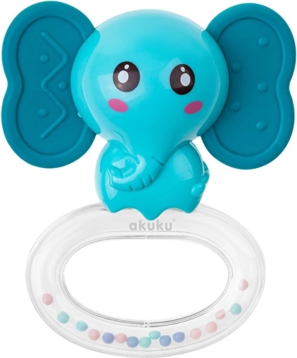 Jucăria de dentiție din silicon cu zornăitoare Akuku elefant combină masajul delicat al gingiilor cu sunetul plăcut al zornăitorii, care motivează copilul la joacă și dezvoltă percepția auditivă. Forma ergonomică și construcția ușoară facilitează prinderea și susțin dezvoltarea motricității fine.