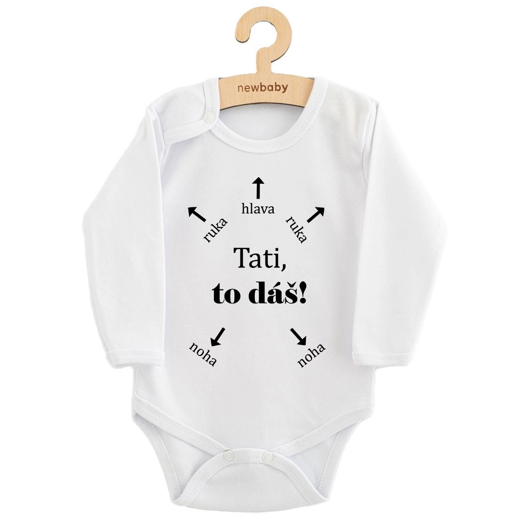 Body adorabil pentru bebeluși cu mânecă lungă de la New Baby, cu inscripția amuzantă Tati, poți tu!, care va bucura orice părinte. Este confecționat din 100% bumbac, delicat cu pielea sensibilă a bebelușului. Închiderea cu capse pe umăr și între piciorușe facilitează îmbrăcarea și schimbarea. Imprimeul este realizat cu vopsele certificate, potrivite pentru bebeluși.