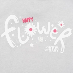 Set drăgălaș din două piese pentru bebeluși New Baby Happy Flower, în culoarea gri, care oferă confort și stil în fiecare zi. Include un tricou cu inscripția Happy flower și mâneci cu volănașe, precum și pantalonași de trening cu imprimeu floral all-over. Datorită 100% bumbac este delicat cu pielea sensibilă a copiilor, iar închiderea cu capse la gât ușurează îmbrăcarea.