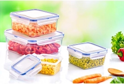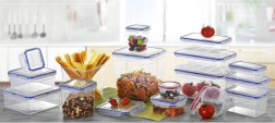 Pereții transparenți permit verificarea rapidă a conținutului, iar posibilitatea de stivuire economisește spațiu în frigider și dulapuri.