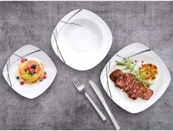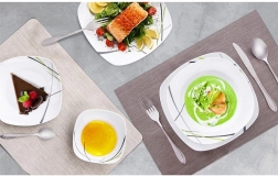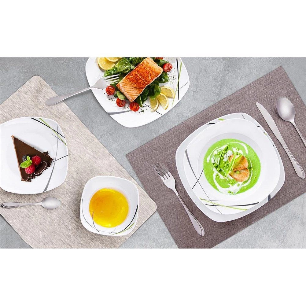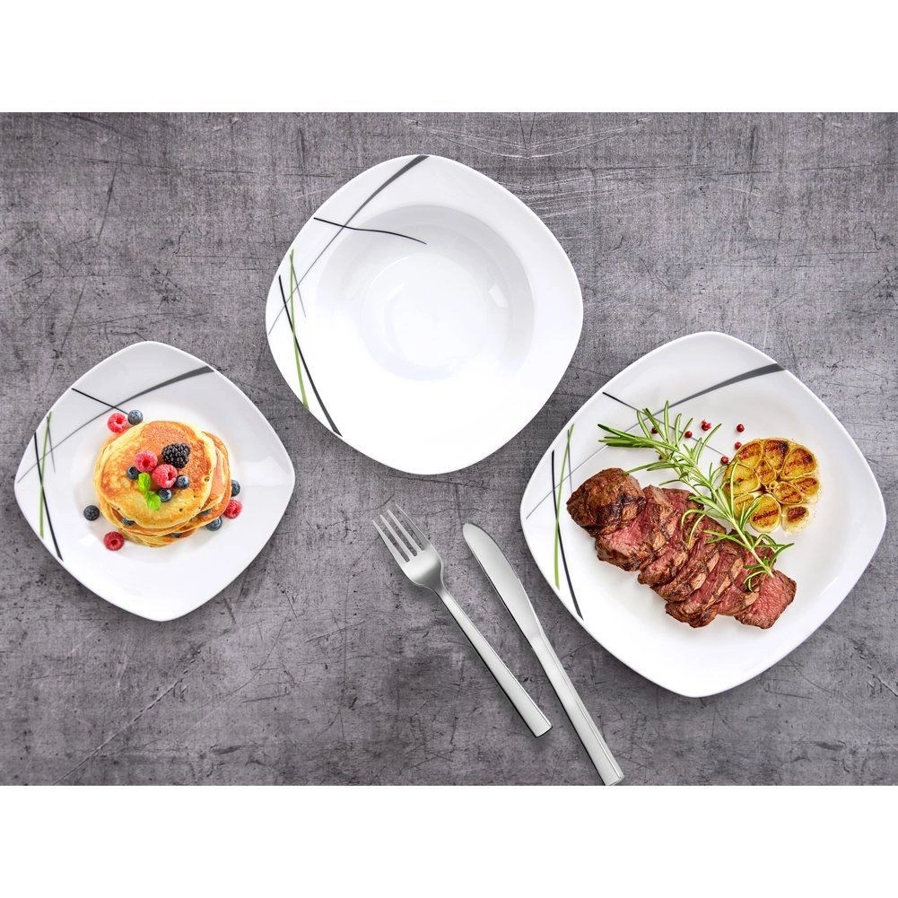 Acest set de masă pătrat din porţelan de calitate aduce stil şi practicitate în orice gospodărie. Decorul modern în combinaţii de verde, negru şi gri arată excelent pe masă şi se potriveşte uşor cu restul accesoriilor. Este ideal pentru mic dejun, prânz şi cină şi este perfect pentru întâlniri în familie şi mese festive.