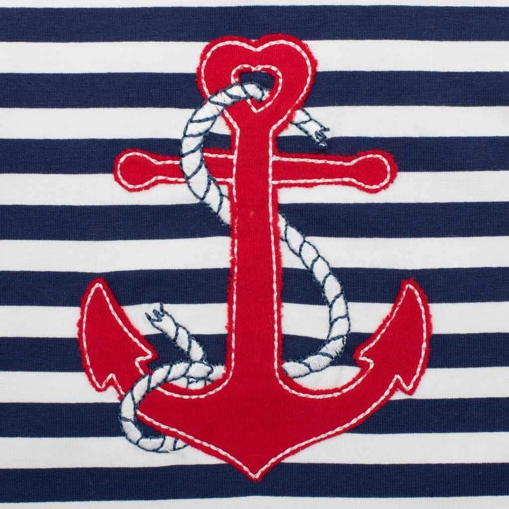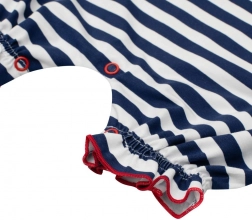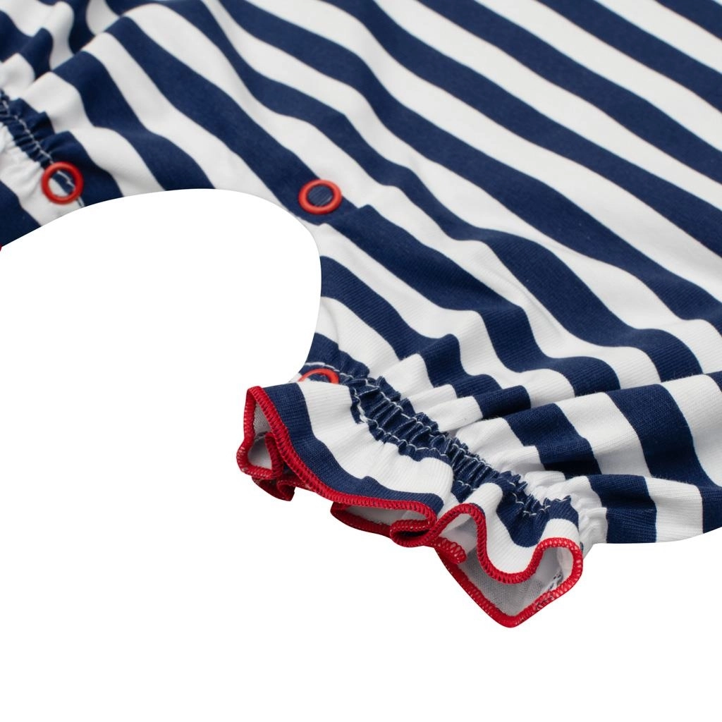 Adorabila salopetă de vară pentru fetițe New Baby Marine, din bumbac 100% plăcut la atingere, oferă confort și stil în fiecare zi. Are mâneci scurte cu volănașe, model modern în dungi și aplicație cu ancoră căptușită pe dos pentru a preveni zgârierea. Închiderea cu capse pe umăr și între piciorușe facilitează îmbrăcarea și schimbarea scutecului.