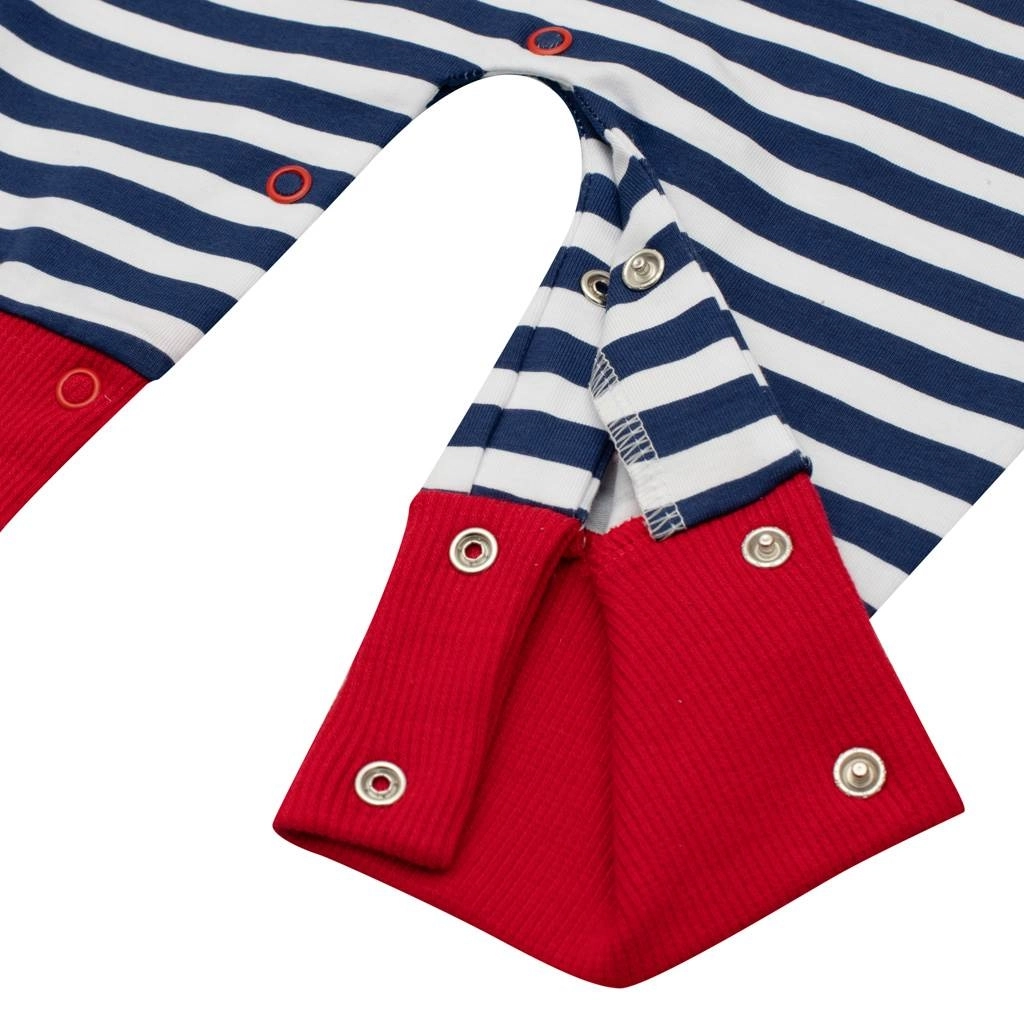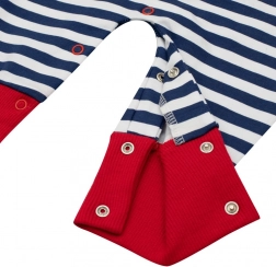 Salopetă de vară stilată pentru bebeluși, cu dungi marinărești și aplicație cu bărcuță. Este confecționată din 100% bumbac plăcut la atingere, are închidere practică pe umăr și între piciorușe pentru îmbrăcare și schimbare ușoare și, datorită croielii, menține mereu acoperit spatele bebelușului.