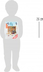 - piese din lemn cu motive de pirați, ace aurii, placă elastică din plută, ciocănel din lemn, 4 carduri față-verso cu modele, cutie de depozitare