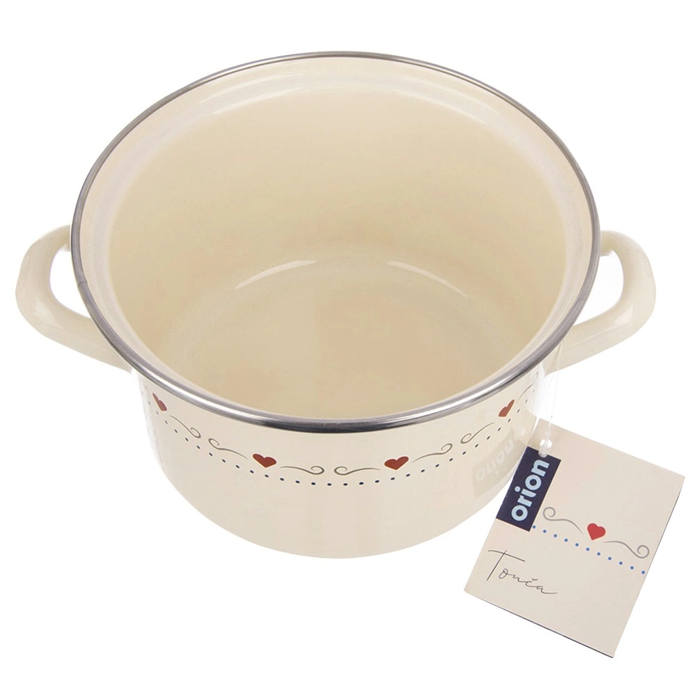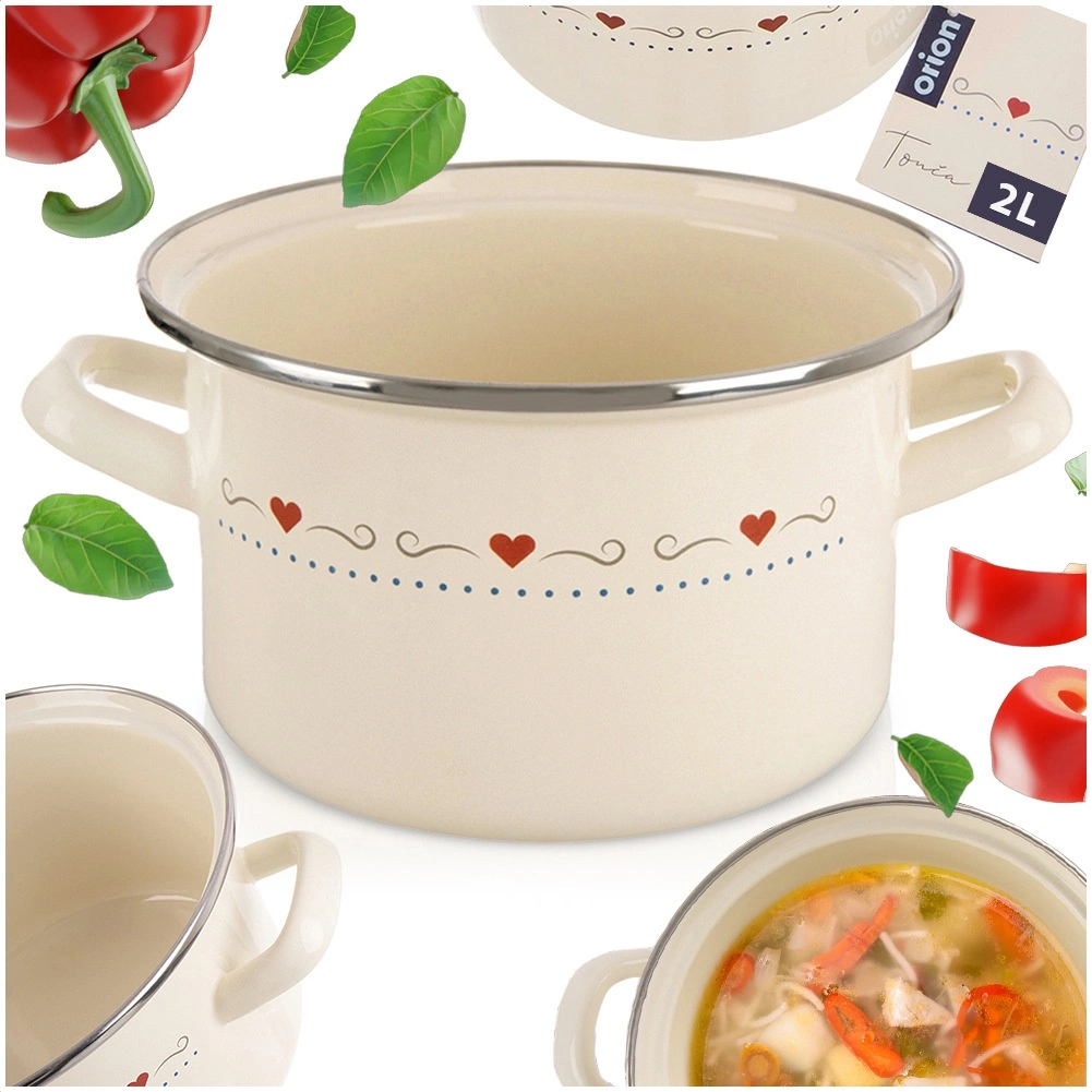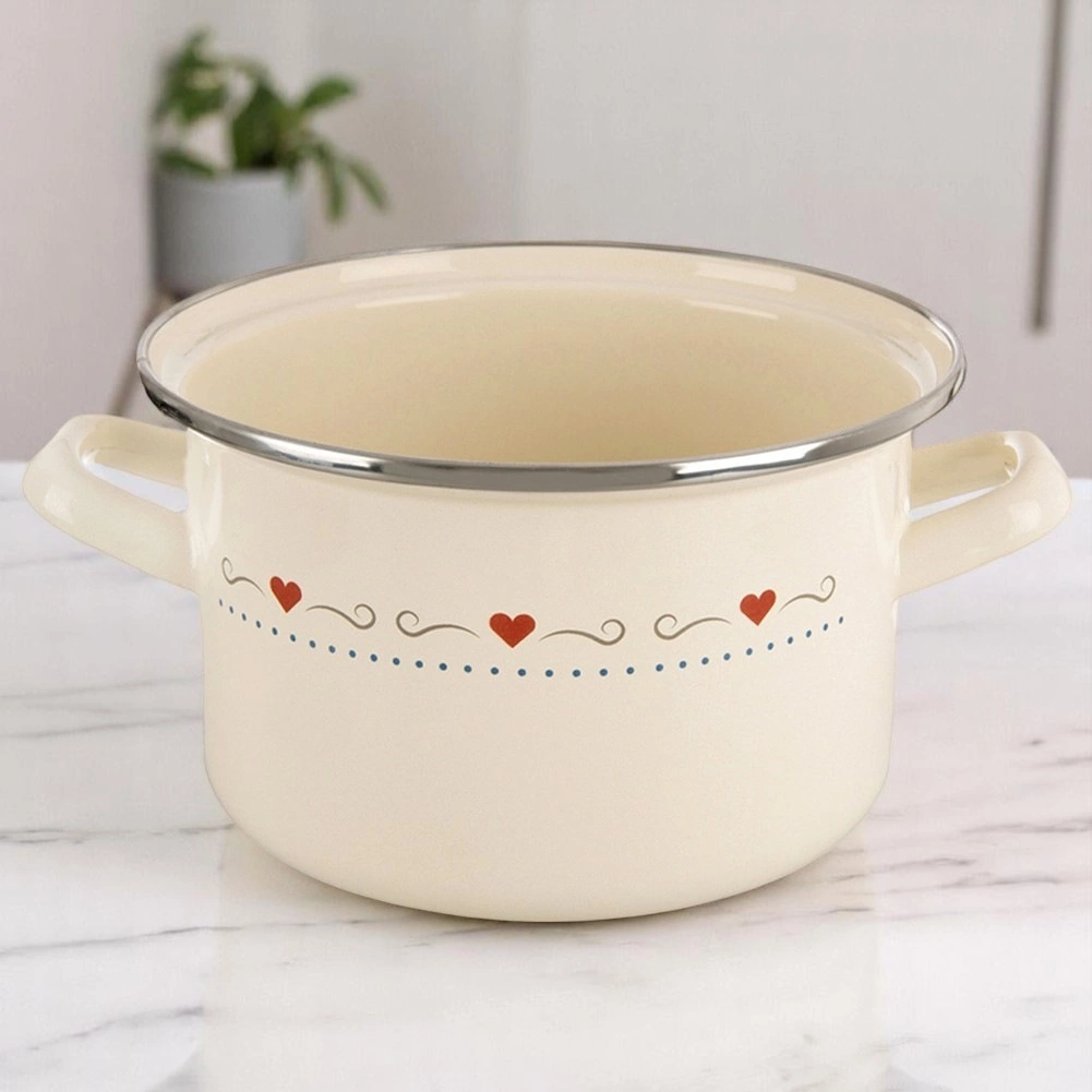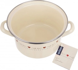 Descoperiți un ajutor practic pentru gătitul de zi cu zi. Oala emailată TONCA, în stil retro, este ideală pentru fierbere și înăbușire de supe, sosuri și feluri principale. Frumosul design crem cu inimioare va înfrumuseța bucătăria, iar mânerele solide asigură o manipulare sigură.