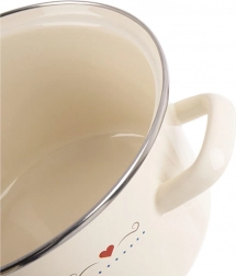 Elegantă oală emailată cu un volum de 2 l, în culoare crem, cu un motiv delicat de inimioare. Potrivită pentru toate tipurile de plite, inclusiv inducție, precum și pentru cuptor. Datorită mânere lor ergonomice se transportă ușor și poate fi spălată în mașina de spălat vase. Oțelul emailat, prietenos cu sănătatea, este sigur chiar și pentru persoanele alergice.