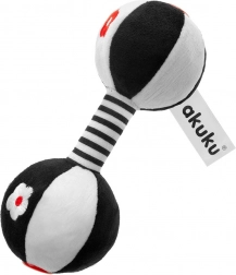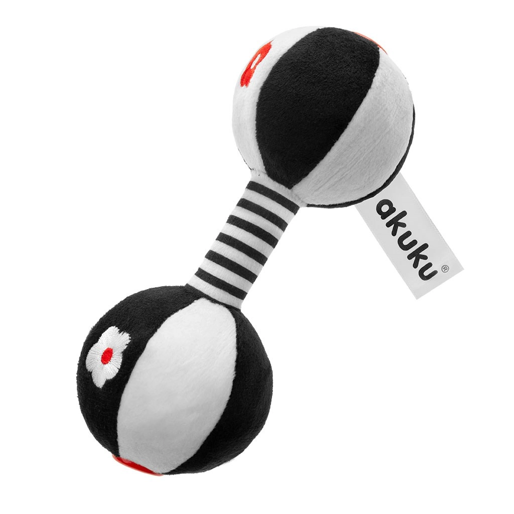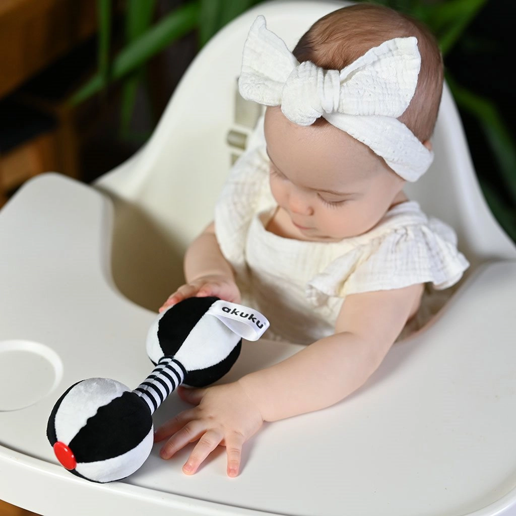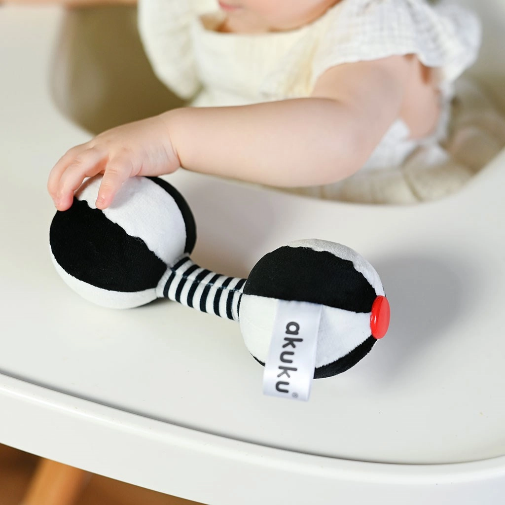 Această jucărie cu contrast în formă de halteră este realizată din material plușat plăcut, blând cu pielea sensibilă a bebelușului. Elementele alb-negru atrag atenția și susțin percepția vizuală încă din primele zile. În interior sunt plasați clopoței fini care, la mișcare, emit sunete și ajută la dezvoltarea percepțiilor auditive.