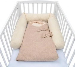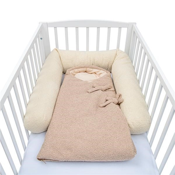 Înveliș practic și sac de dormit NEW BABY Teddy în culoare bej, o variantă modernă a înfășatului clasic. Datorită închiderii cu fermoar și curelelor de legare, înfășoară perfect bebelușul, oferindu-i senzație de siguranță și căldură plăcută. Colecția TEDDY impresionează prin textura bouclé de efect, moliciune și aspect elegant.