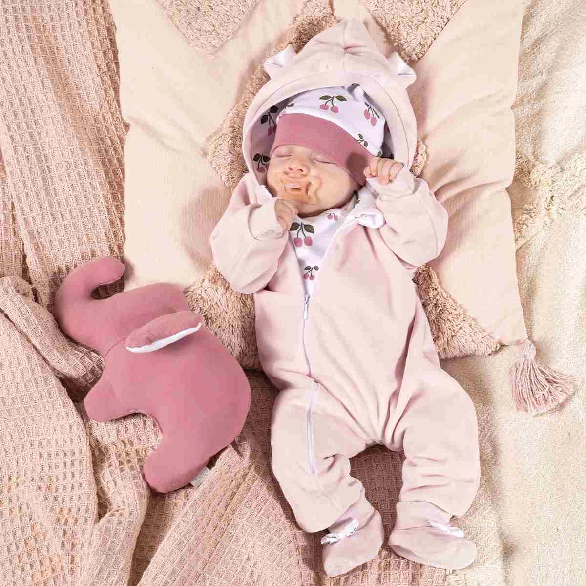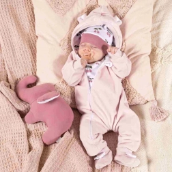 Detaliile practice, precum manșetele rabatabile și gluga cu urechiușe drăguțe, îl fac alegerea ideală pentru plimbările zilnice și pentru călătoriile în cărucior. Materialul își menține forma și aspectul pe termen lung, astfel încât combinezonul arată grozav chiar și după spălări repetate.