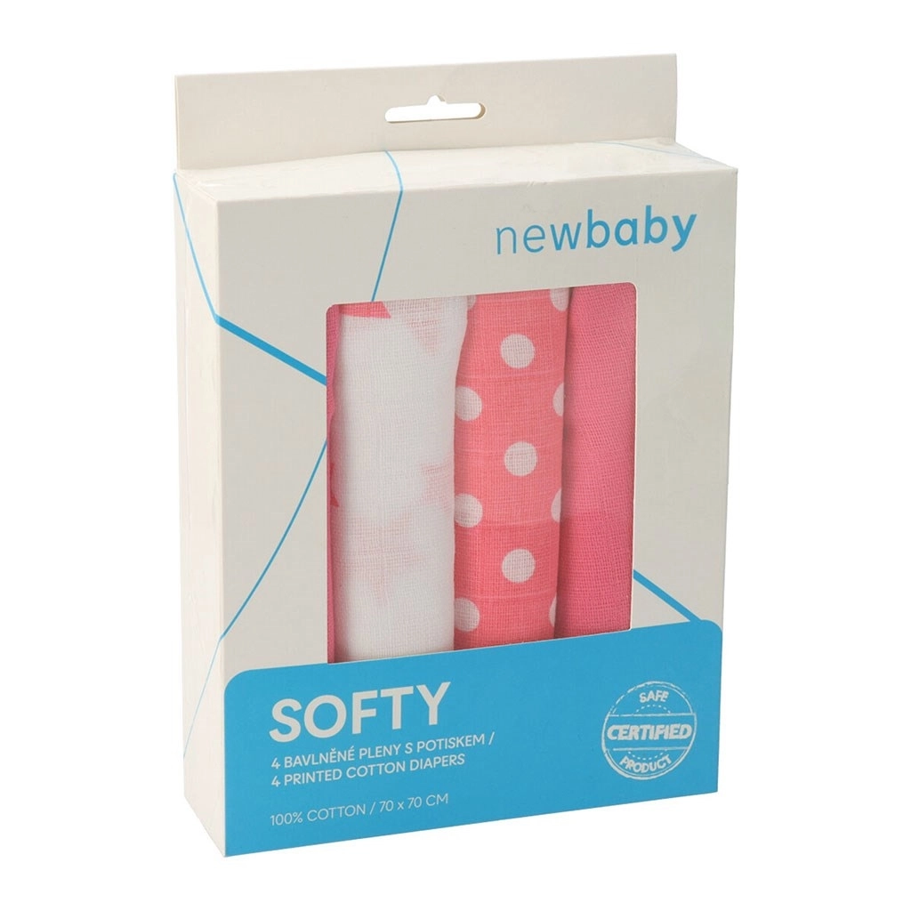 Scutecele textile New Baby Softy, foarte moi, sunt de neînlocuit pentru îngrijirea zilnică a bebelușului. Sunt realizate din 100% bumbac cu o structură dublu-strat, au margine întărită cu patru cusături pentru o durată de viață mai mare și o formă stabilă. Ambalajul practic de 4 bucăți în combinație de roz și alb, cu imprimeu atemporal, poate fi folosit ca prosop, băbiță, parasolar pentru cărucior sau suport pentru eructare.