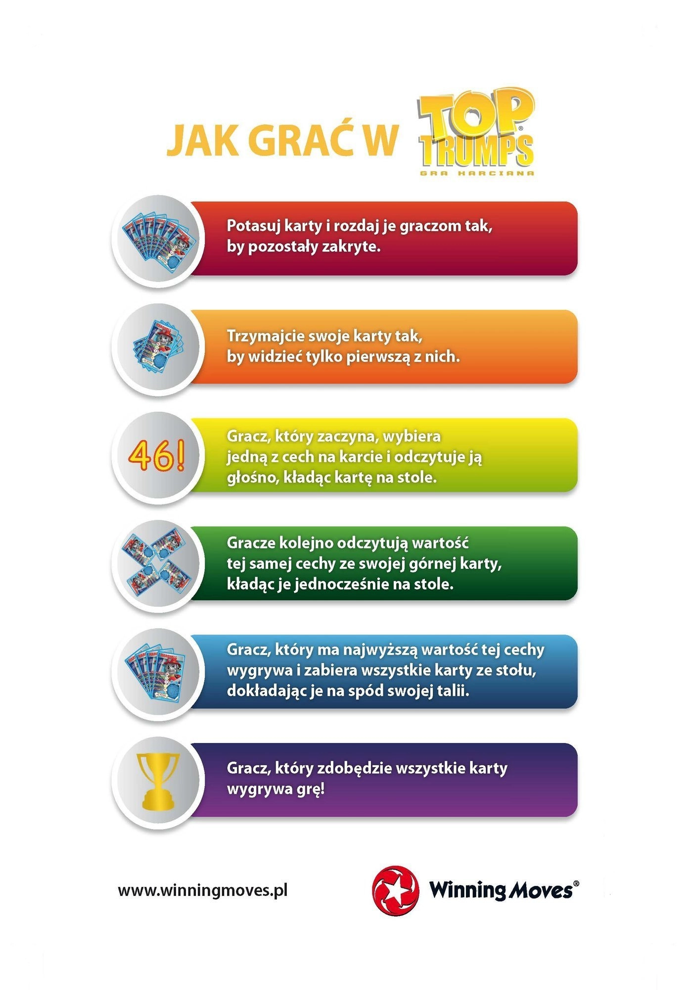 Jucătorii își împart cărțile amestecate, privesc prima carte, iar jucătorul activ alege una dintre cele cinci caracteristici. Cine are cea mai mare valoare ia cărțile și jocul continuă până când unul le câștigă pe toate. O rundă rapidă durează aproximativ 15 minute, așa că este alegerea ideală pentru pauze scurte, călătorii sau după-amieze de joacă în familie.
