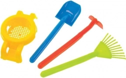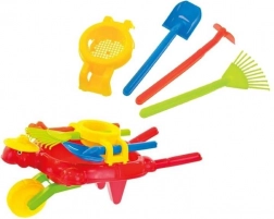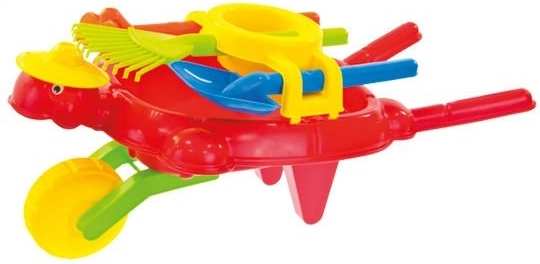 Roata mare, mobilă, asigură o deplasare lină și stabilă pe diferite suprafețe, în timp ce cele două suporturi permit așezarea roabei în siguranță. Mânerele ergonomice sunt adaptate palmelor copiilor și oferă o prindere sigură. În pachet se regăsesc accesorii practice: greblă, lopățică, hârleț mic și sită – ideale pentru transportul pământului, strângerea frunzelor sau cernerea nisipului.