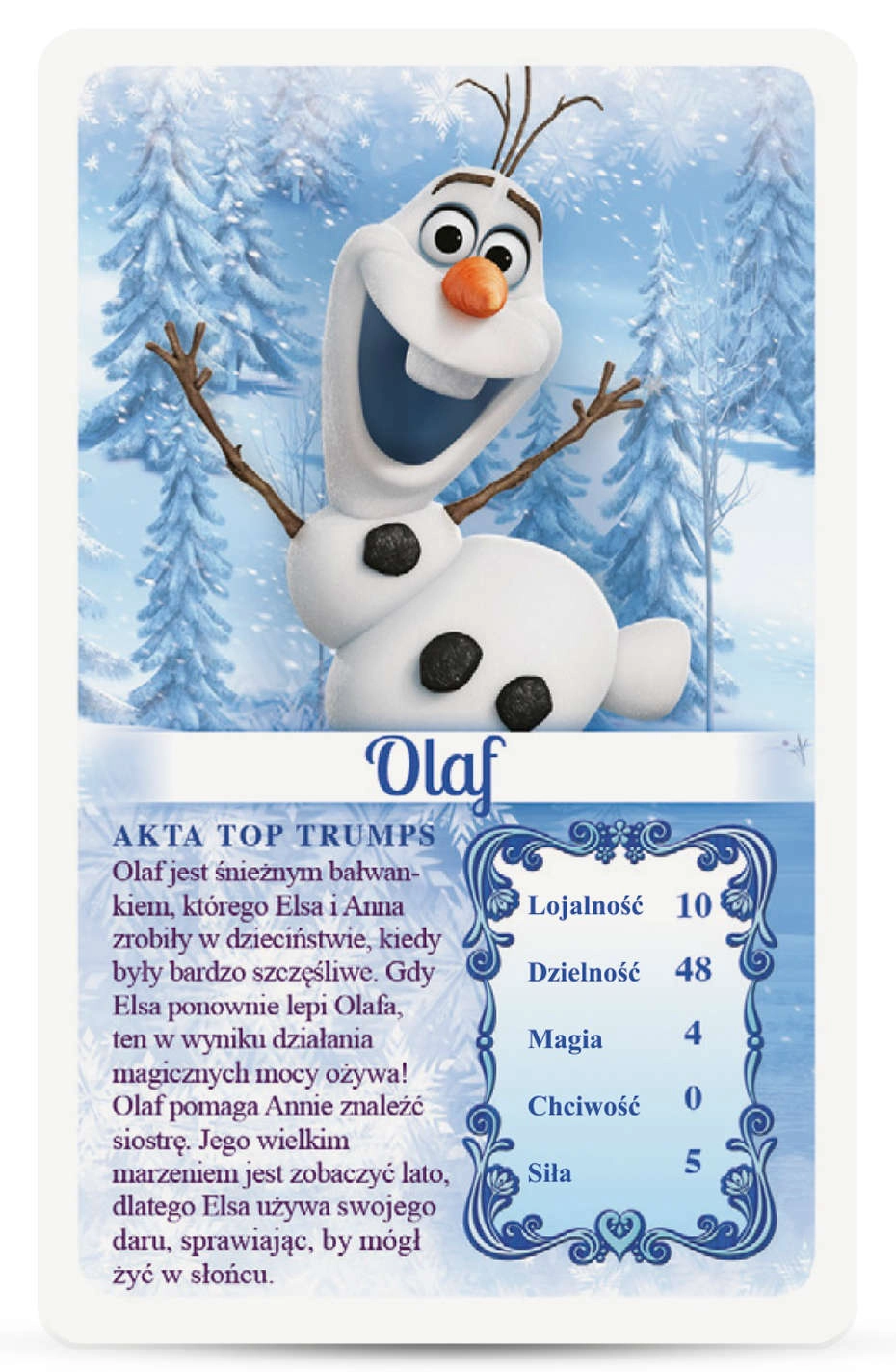 Top Trumps este un joc de cărți îndrăgit, care încântă familiile de zeci de ani. În ediția Regatul de Gheață veți întâlni eroii din popularul film DISNEY și le veți compara caracteristicile, precum magia, curajul sau înțelepciunea. Scopul este să alegeți valoarea mai bună și să câștigați cărțile adversarilor – câștigă cel care adună întregul pachet.