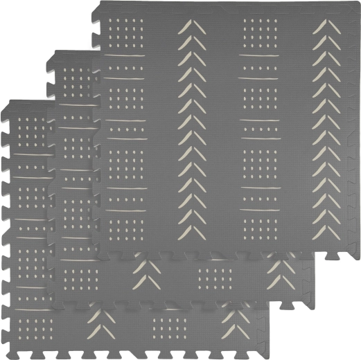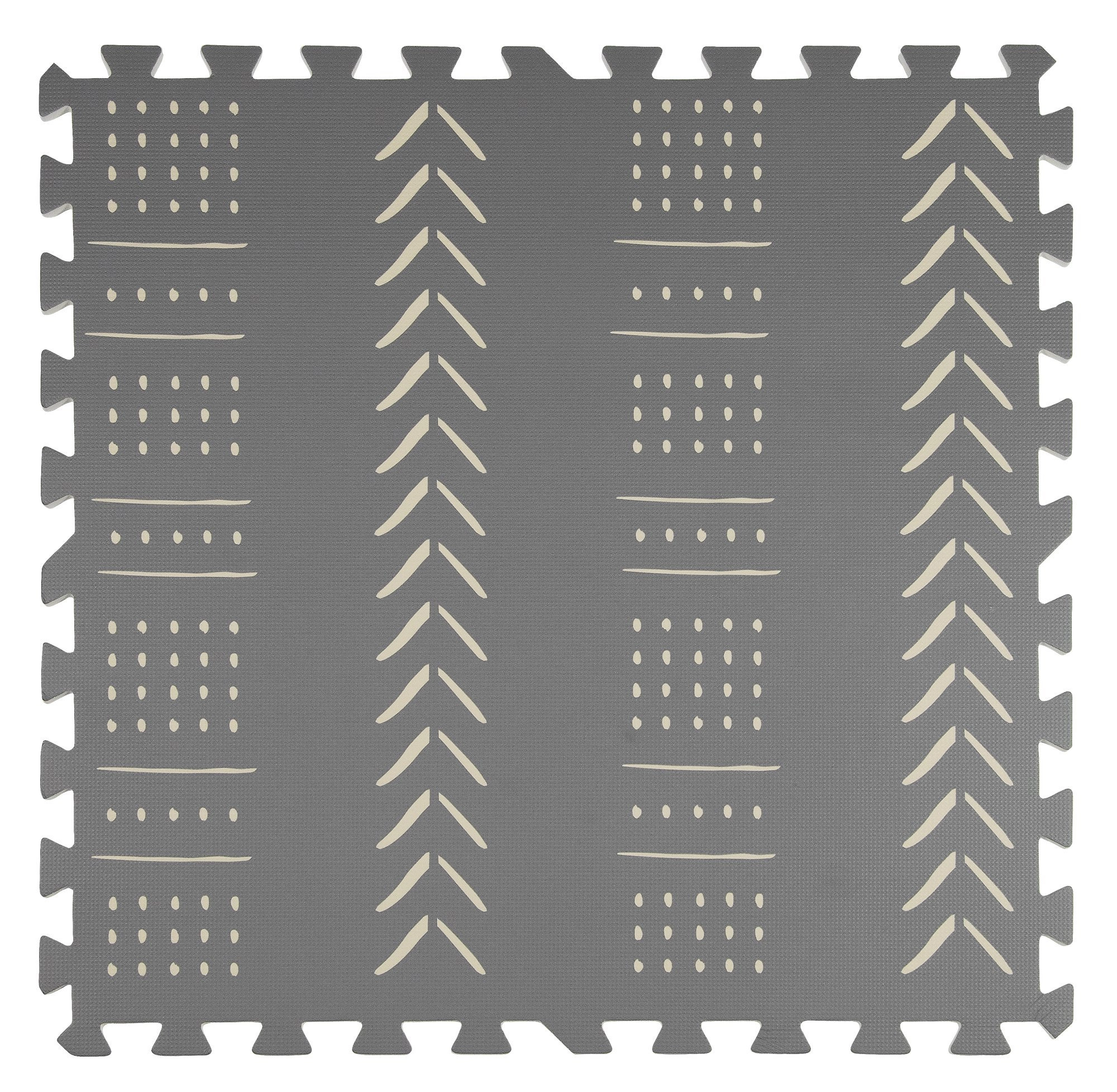 Motivul boho gri elegant este neutru și discret, fiind potrivit pentru camera copilului, living sau camera de joacă. Suprafața este antiderapantă și potrivită pentru învățarea târârii și mersului. Materialul este impermeabil și igienic – este suficient să fie șters cu o cârpă umedă. Salteaua nu conține ftalați, formamidă, PVC sau BPA și poartă marcajul CE.