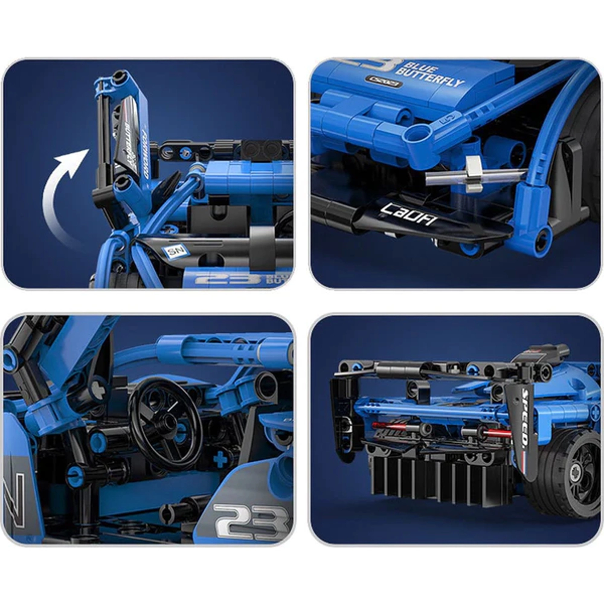 Modelul, într-o elegantă culoare albastră cu elemente negre, oferă uși care se deschid, eleron reglabil și volan funcțional. Piesele sunt compatibile cu alte seturi CADA, astfel încât îți poți extinde colecția și crea construcții și mai mari. Ambalajul este reprezentativ, ideal ca cadou pentru copii de la 6 ani și pentru constructori entuziaști.