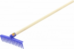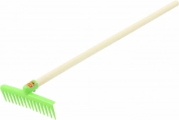 Mânerul din lemn și capul din plastic creează un instrument echilibrat și ușor, cu care copiii se descurcă atât la joacă, cât și la greblarea ușoară.