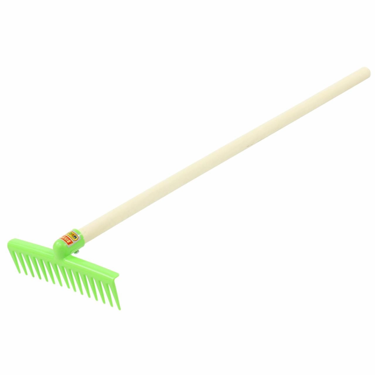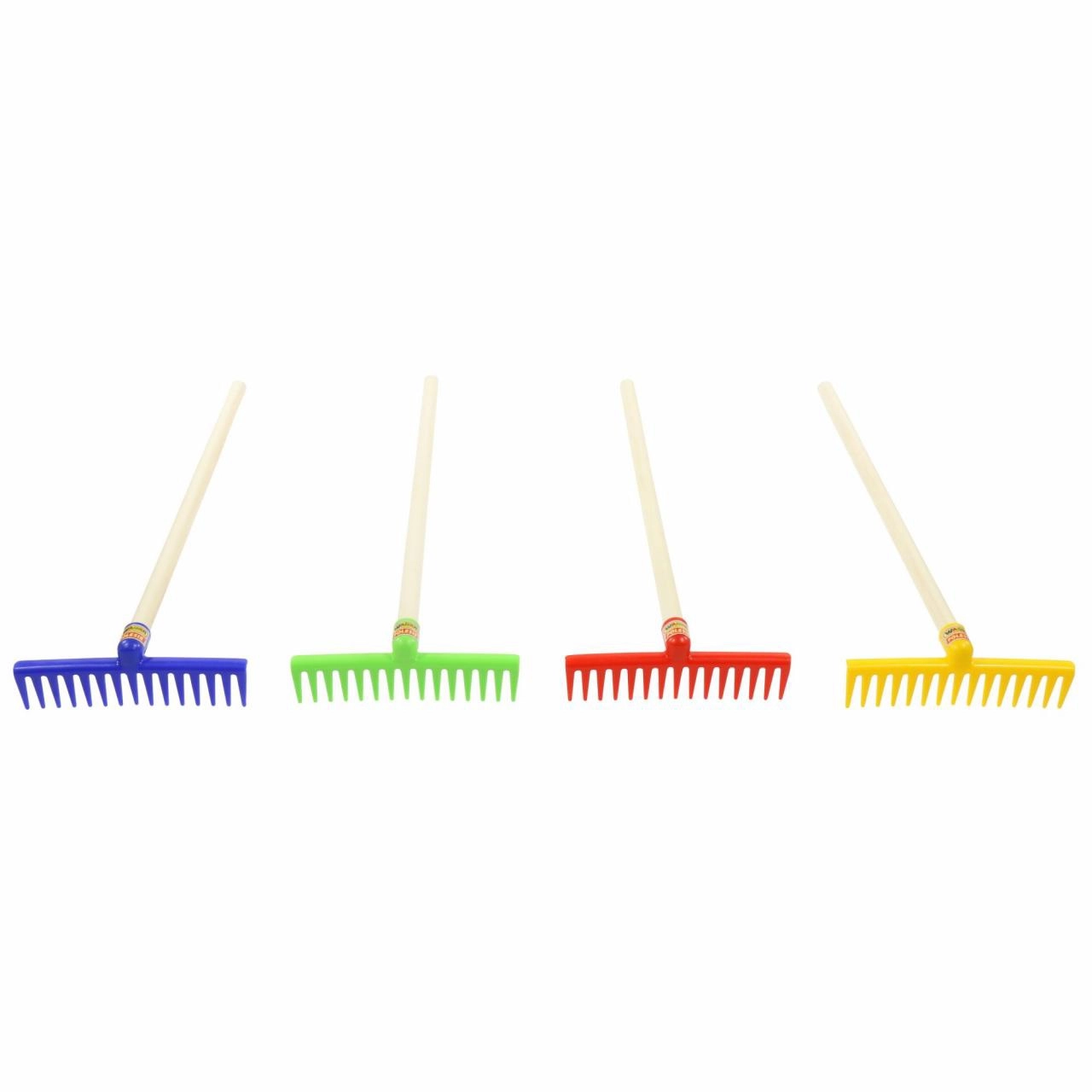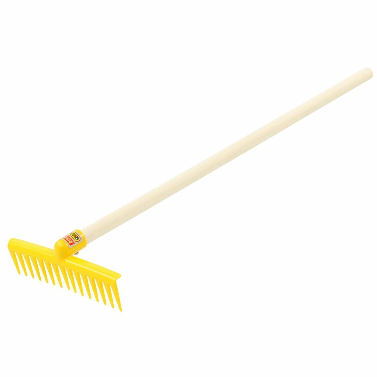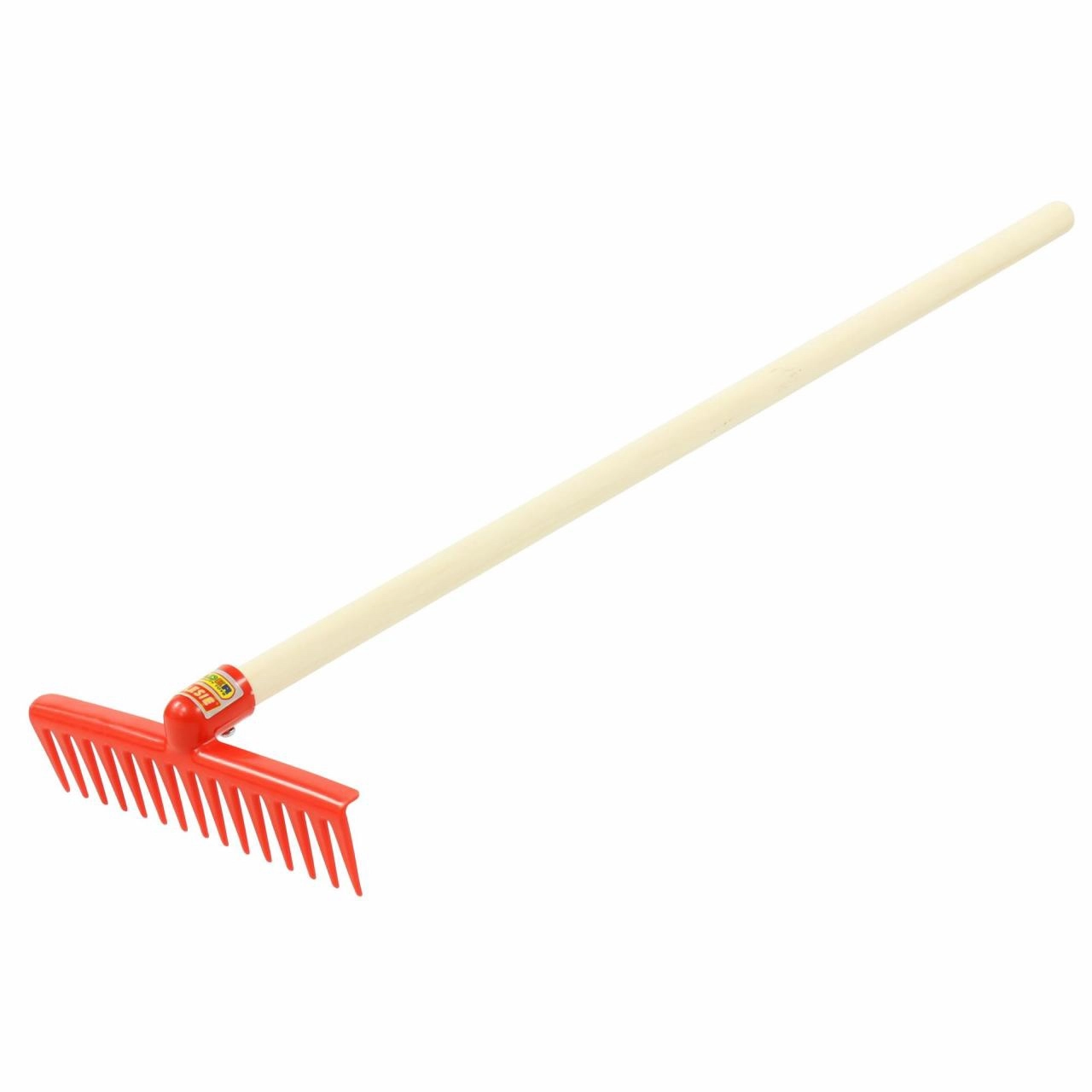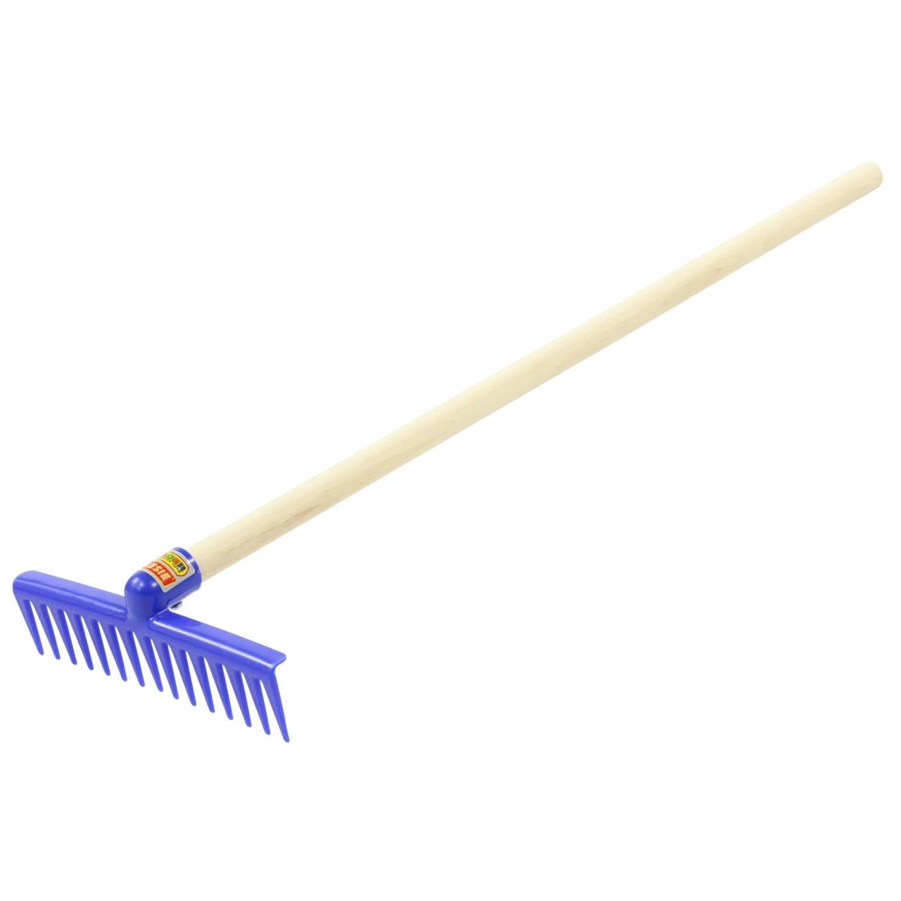 Oferiți-le copiilor bucuria timpului petrecut afară cu o greblă practică și ușoară, care se potrivește perfect în mână. Mânerul lung și neted din lemn și capul din plastic solid, cu dinți lați, facilitează greblarea frunzelor, nisipului și a micilor resturi.