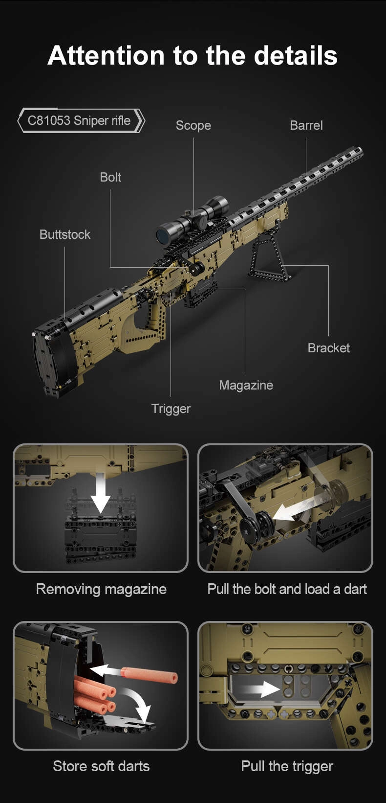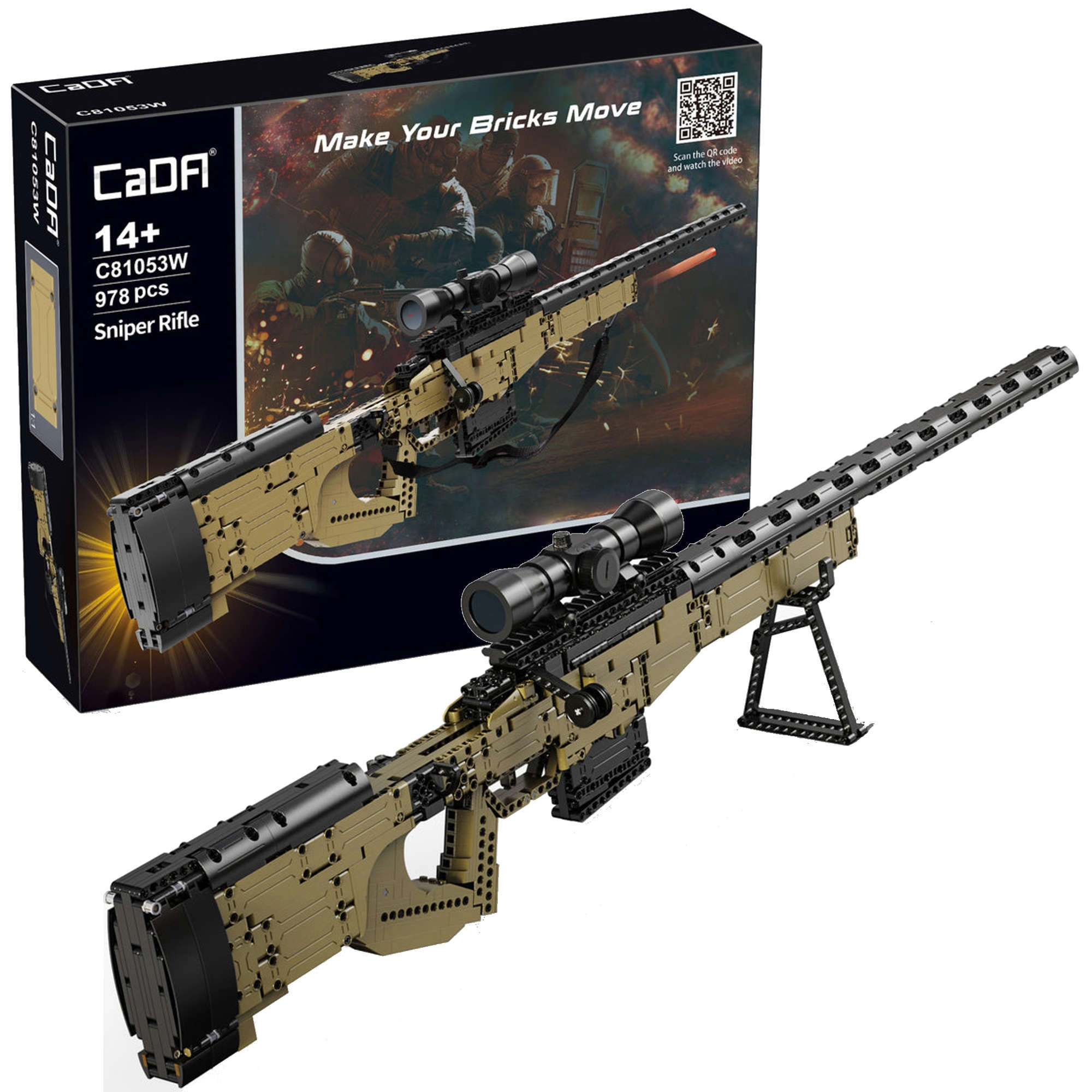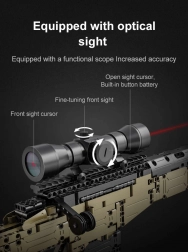 Acest set detaliat de la brandul DOUBLE EAGLE/CADA aduce un proiect atractiv pentru copiii mai mari și adolescenți. Vei asambla un model impresionant de pușcă de lunetist SNIPER RIFLE cu multe părți mobile, inclusiv încărcător și optică de ochire. Datorită curelei incluse, modelul este ușor de transportat.