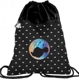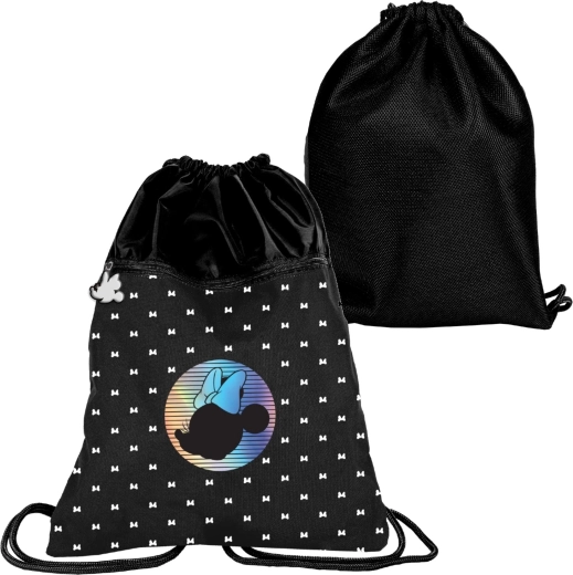 Săculeț sport elegant cu motiv MINNIE MOUSE în culoare neagră și imprimeu holografic. Are o construcție ușoară, o compartimentare principală spațioasă cu închidere prin șnur și buzunar cu fermoar pentru mărunțișuri. Partea din spate este pentru confort ranforsată și ventilată cu plasă, iar șnururile împletite rezistente permit purtarea comodă pe spate sau pe umăr.