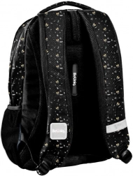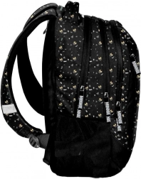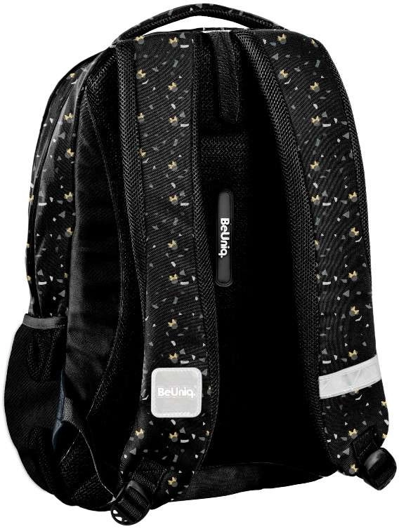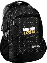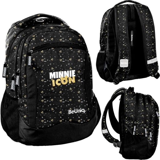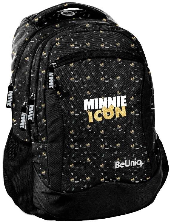 Rucsacul școlar BeUniq MINNIE Icon de la marca Paso, ușor și rezistent, în variantă negru‑auriu, oferă trei compartimente spațioase, buzunar frontal cu fermoar și două buzunare laterale din plasă. Are bretele căptușite, ergonomice, spate întărit și profilat cu material respirabil din plasă și elemente reflectorizante pentru siguranță. Datorită poliesterului impermeabil de calitate și greutății reduse, este ideal pentru uz zilnic la școală și în timpul liber.