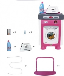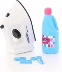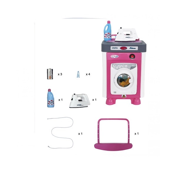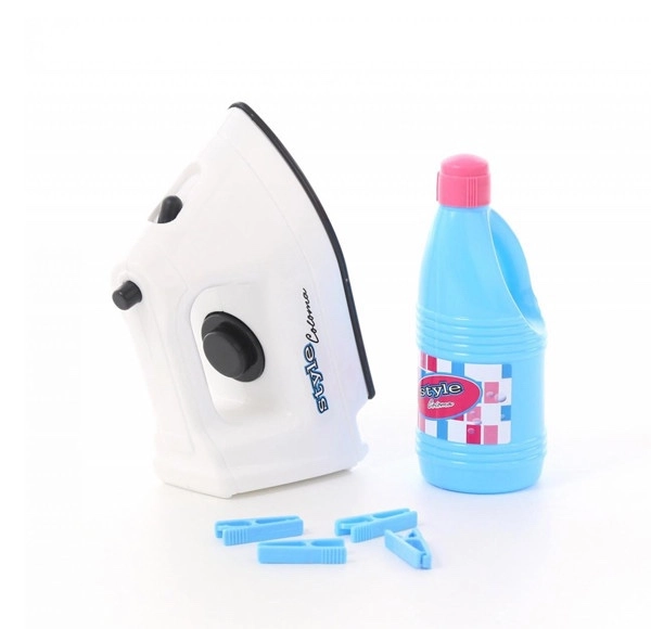 Pachetul include echipare completă pentru micii ajutoare: panou de joc/masă de călcat cu suprafață textilă pentru „călcat” în siguranță, fier de călcat pentru copii, umeraș/uscător de rufe cu sfoară și 4 cleme. Datorită bateriilor incluse, vă puteți juca imediat după despachetare.