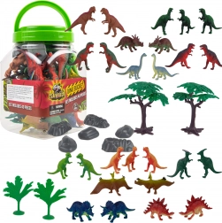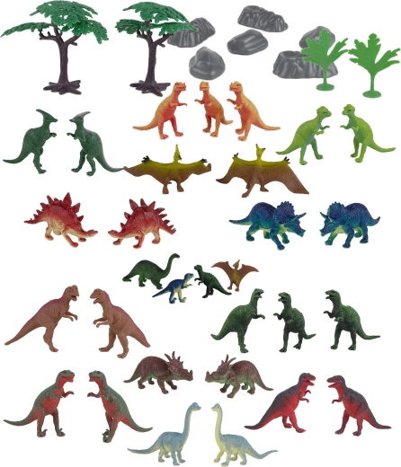 Descoperă lumea preistorică cu o colecție variată de dinozauri mici și accesorii. Setul include specii carnivore și ierbivore în diferite poziții și mărimi, completate de copaci și pietre din plastic pentru construirea propriilor scene. Execuția precisă și suprafețele texturate sprijină imaginația, povestirea și joaca educativă.