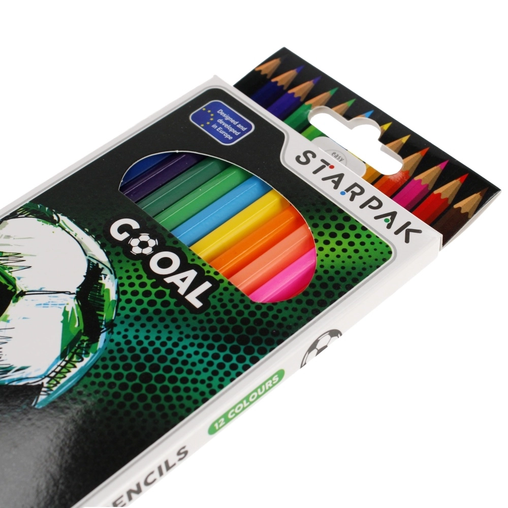 Descoperă bucuria desenului cu setul de 12 creioane colorate cu motiv de fotbal. Datorită profilului hexagonal, creioanele se țin confortabil în mână, se rostogolesc mai puțin de pe masă și permit lucru precis și hașurare fină. Miezurile preascuțite și pigmenții intenși oferă o acoperire frumoasă și uniformă.