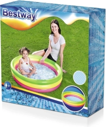 Piscina ușoară și compactă, cu diametrul de 102 cm și înălțimea de 25 cm, este o alegere excelentă pentru copii de la 2 ani. Trei inele colorate, cu valve separate, asigură stabilitate și siguranță la joacă, în timp ce fundul gonflabil oferă confort suplimentar chiar și pe suprafețe mai dure. Capacitatea de 62 de litri este potrivită pentru o răcorire plăcută și primele jocuri cu apă.