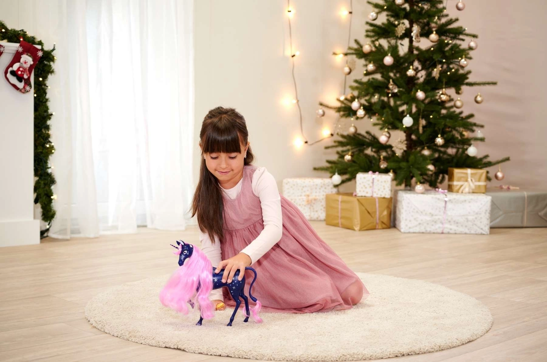 Descoperă magia Centopiei cu minunata figurină a unicornului stelar inspirată de serialul Mia and Me. Corpul albastru închis este decorat cu numeroase steluțe care se încarcă la lumină și apoi strălucesc magic în întuneric – ca un cer de noapte plin de stele sclipitoare. Coama și coada lungă roz invită la pieptănat creativ.