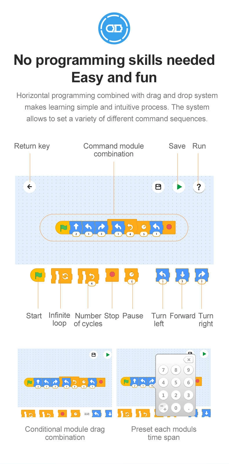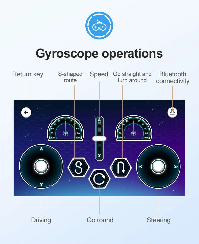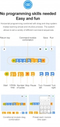 Modul Dual Mode permite control în două feluri: cu telecomanda 2,4 GHz (deplasare lină înainte/înapoi și virare) sau prin aplicația mobilă Bluetooth cu rază de peste 25 m. În aplicație găsești 4 moduri de control – de la control clasic până la control giroscopic și programarea traseului. Acest lucru dezvoltă creativitatea, imaginația și abilitățile tehnice.